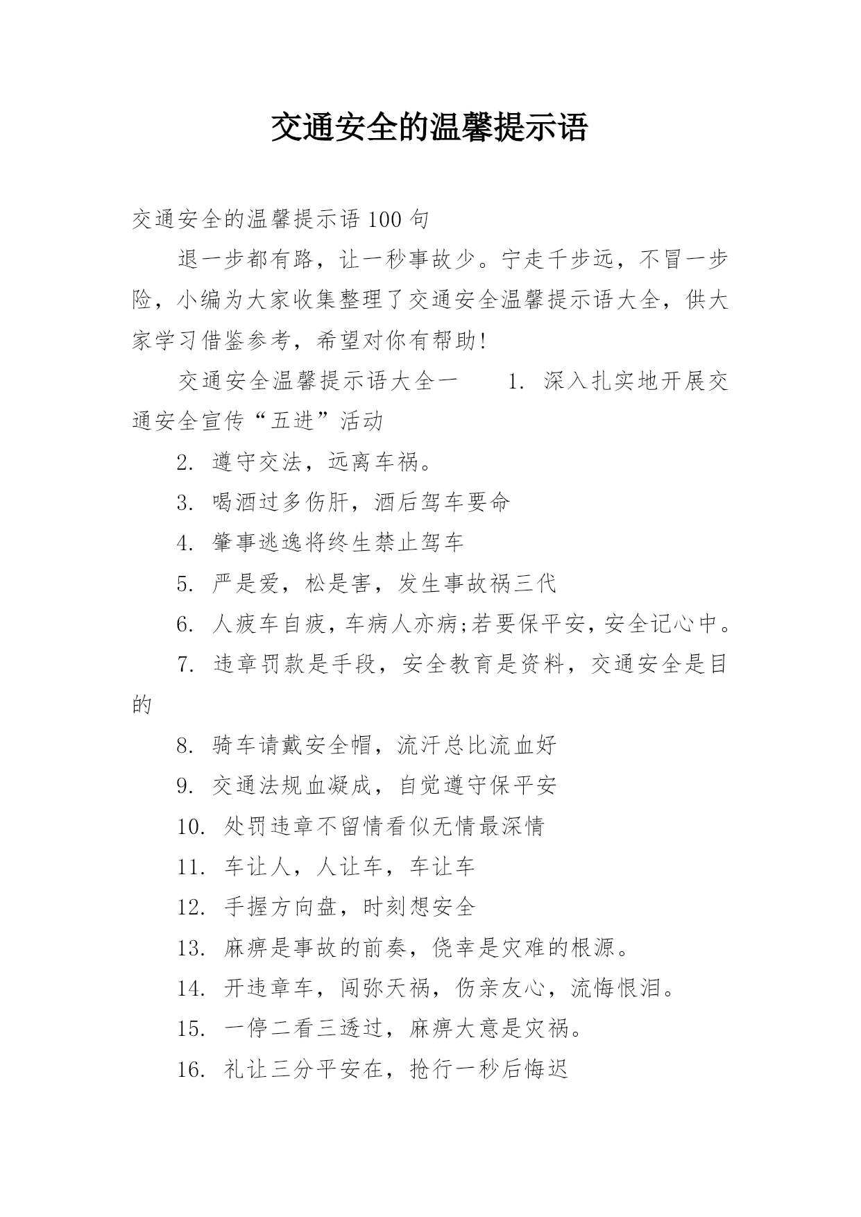 交通安全的温馨提示语交通安全的温馨提示语100句退一步都有路,让一秒事故少。宁走千步远,不冒一步险,小编为大家收集整理了交通安全温馨提示语大全,供大家学习借鉴参考,希望对你有帮助!交通安全温馨提示语大全一1.深入扎实地开展交通安全宣传“五进”活动2.遵守交法,远离车祸。3.喝酒过多伤肝,酒后驾车要命4.肇事逃逸将终生禁止驾车5.严是爱,松是害,发生事故祸三代6.人疲车自疲,车病人亦病;若要保平安,安全记心中。7.违章罚款是手段,安全教育是资料,交通安全是目的8.骑车请戴安全帽,流汗总比流血好9.交通法规血