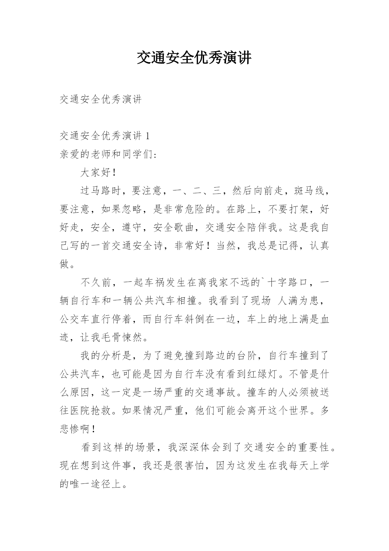 交通安全优秀演讲交通安全优秀演讲交通安全优秀演讲1亲爱的老师和同学们:大家好!过马路时,要注意,一、二、三,然后向前走,斑马线,要注意,如果忽略,是非常危险的。在路上,不要打架,好好走,安全,遵守,安全歌曲,交通安全陪伴我。这是我自己写的一首交通安全诗,非常好!当然,我总是记得,认真做。不久前,一起车祸发生在离我家不远的`十字路口,一辆自行车和一辆公共汽车相撞。我看到了现场人满为患,公交车直行停着,而自行车斜倒在一边,车上的地上满是血迹,让我毛骨悚然。我的分析是,为了避免撞到路边的台阶,自行车撞到了公共汽