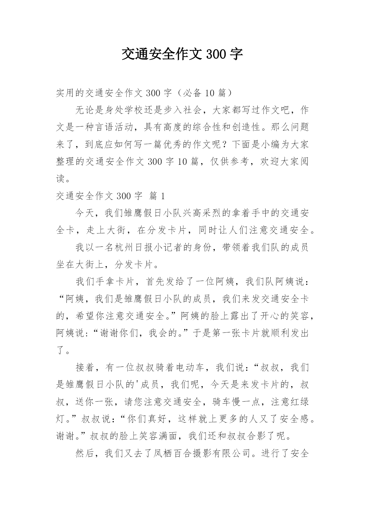 交通安全作文300字实用的交通安全作文300字(必备10篇)无论是身处学校还是步入社会,大家都写过作文吧,作文是一种言语活动,具有高度的综合性和创造性。那么问题来了,到底应如何写一篇优秀的作文呢?下面是小编为大家整理的交通安全作文300字10篇,仅供参考,欢迎大家阅读。交通安全作文300字篇1今天,我们雏鹰假日小队兴高采烈的拿着手中的交通安全卡,走上大街,在分发卡片,同时让人们注意交通安全。我以一名杭州日报小记者的身份,带领着我们队的成员坐在大街上,分发卡片。我们手拿卡片,首先发给了一位阿姨,我们队阿姨说