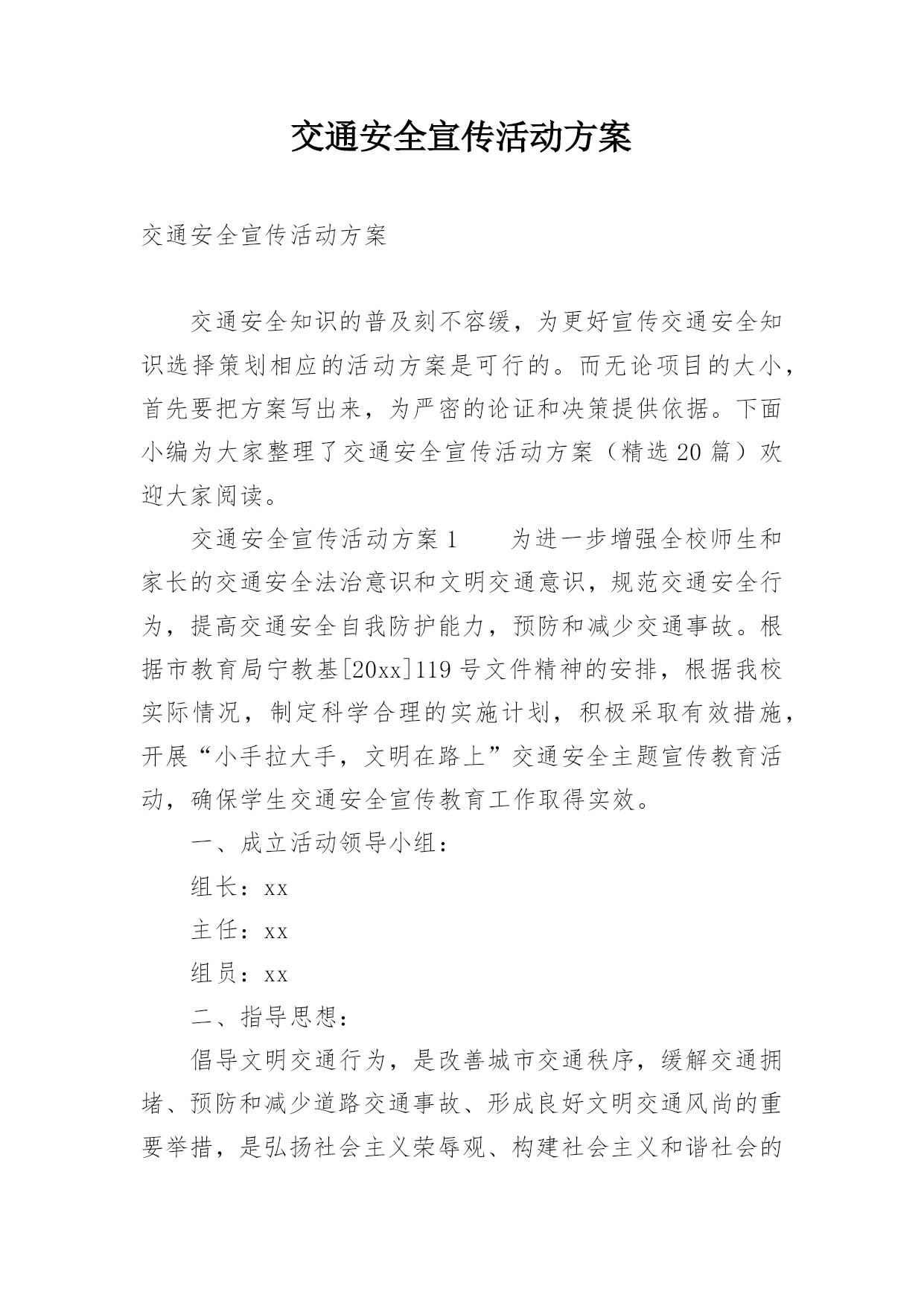 交通安全宣传活动方案交通安全宣传活动方案交通安全知识的普及刻不容缓,为更好宣传交通安全知识选择策划相应的活动方案是可行的。而无论项目的大小,首先要把方案写出来,为严密的论证和决策提供依据。下面小编为大家整理了交通安全宣传活动方案(精选20篇)欢迎大家阅读。交通安全宣传活动方案1为进一步增强全校师生和家长的交通安全法治意识和文明交通意识,规范交通安全行为,提高交通安全自我防护能力,预防和减少交通事故。根据市教育局宁教基[20xx]119号文件精神的安排,根据我校实际情况,制定科学合理的实施计划,积极采取有效