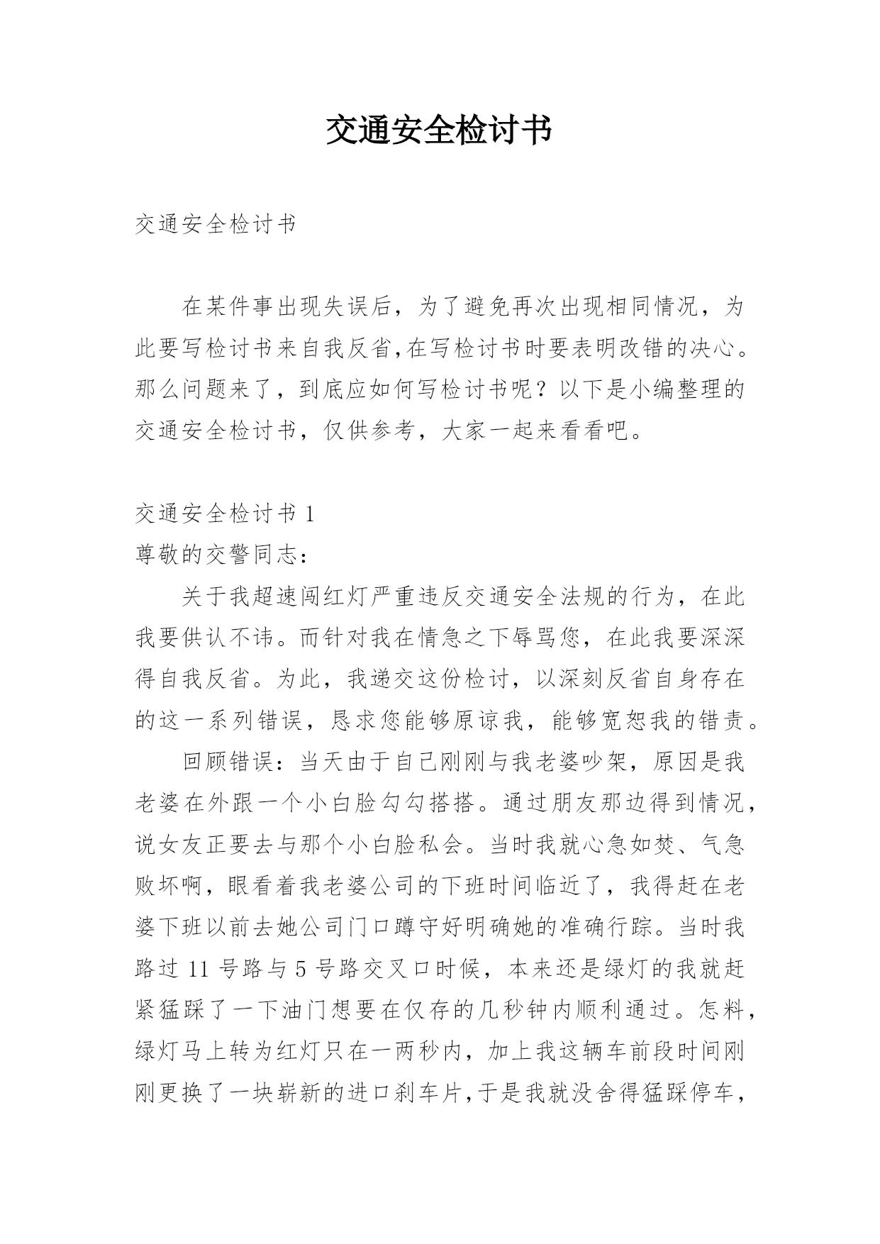 交通安全检讨书交通安全检讨书在某件事出现失误后,为了避免再次出现相同情况,为此要写检讨书来自我反省,在写检讨书时要表明改错的决心。那么问题来了,到底应如何写检讨书呢?以下是小编整理的交通安全检讨书,仅供参考,大家一起来看看吧。交通安全检讨书1尊敬的交警同志:关于我超速闯红灯严重违反交通安全法规的行为,在此我要供认不讳。而针对我在情急之下辱骂您,在此我要深深得自我反省。为此,我递交这份检讨,以深刻反省自身存在的这一系列错误,恳求您能够原谅我,能够宽恕我的错责。回顾错误:当天由于自己刚刚与我老婆吵架,原因是我