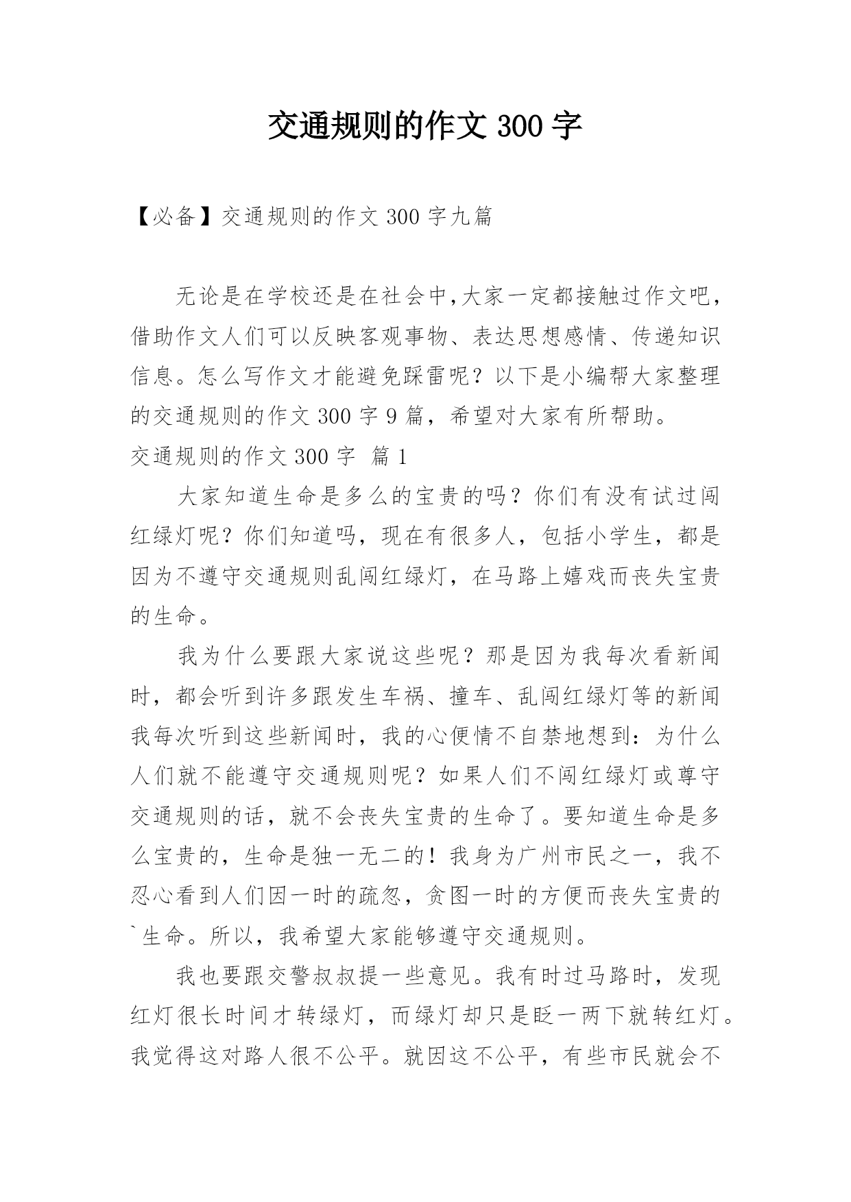 交通规则的作文300字【必备】交通规则的作文300字九篇无论是在学校还是在社会中,大家一定都接触过作文吧,借助作文人们可以反映客观事物、表达思想感情、传递知识信息。怎么写作文才能避免踩雷呢?以下是小编帮大家整理的交通规则的作文300字9篇,希望对大家有所帮助。交通规则的作文300字篇1大家知道生命是多么的宝贵的吗?你们有没有试过闯红绿灯呢?你们知道吗,现在有很多人,包括小学生,都是因为不遵守交通规则乱闯红绿灯,在马路上嬉戏而丧失宝贵的生命。我为什么要跟大家说这些呢?那是因为我每次看新闻时,都会听到许多跟发
