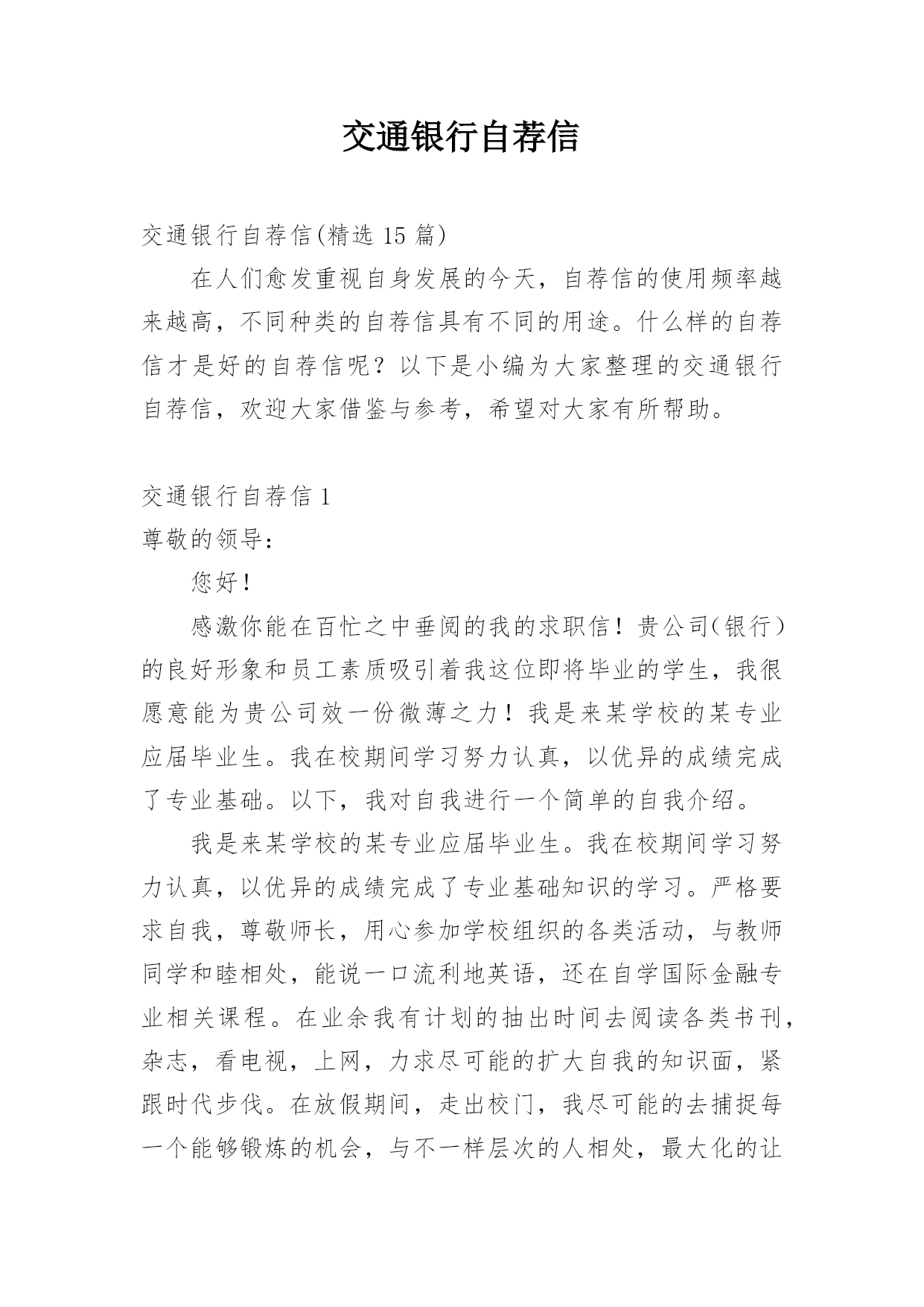 交通银行自荐信交通银行自荐信(精选15篇)在人们愈发重视自身发展的今天,自荐信的使用频率越来越高,不同种类的自荐信具有不同的用途。什么样的自荐信才是好的自荐信呢?以下是小编为大家整理的交通银行自荐信,欢迎大家借鉴与参考,希望对大家有所帮助。交通银行自荐信1尊敬的领导:您好!感激你能在百忙之中垂阅的我的求职信!贵公司(银行)的良好形象和员工素质吸引着我这位即将毕业的学生,我很愿意能为贵公司效一份微薄之力!我是来某学校的某专业应届毕业生。我在校期间学习努力认真,以优异的成绩完成了专业基础。以下,我对自我进行一