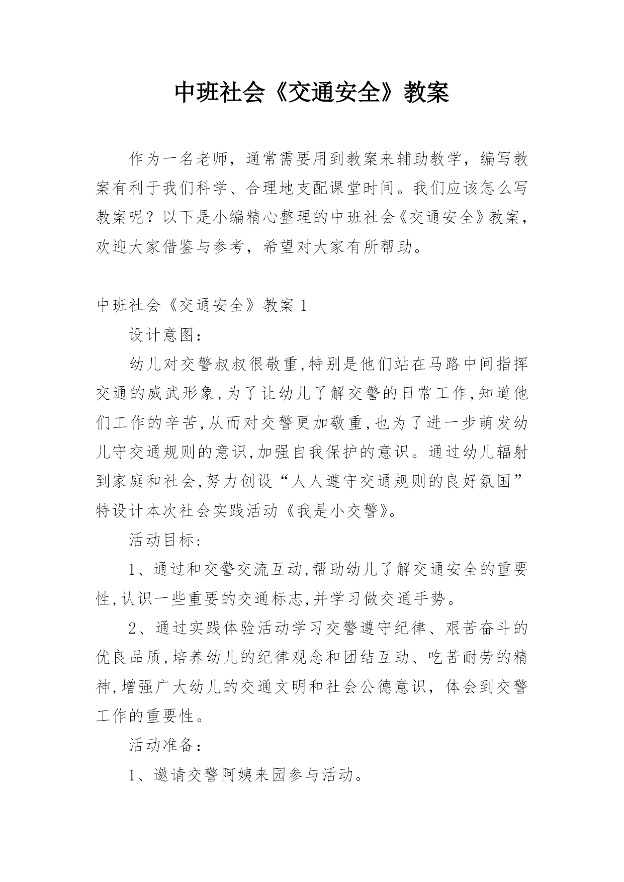 中班社会《交通安全》教案作为一名老师,通常需要用到教案来辅助教学,编写教案有利于我们科学、合理地支配课堂时间。我们应该怎么写教案呢?以下是小编精心整理的中班社会《交通安全》教案,欢迎大家借鉴与参考,希望对大家有所帮助。中班社会《交通安全》教案1设计意图:幼儿对交警叔叔很敬重,特别是他们站在马路中间指挥交通的威武形象,为了让幼儿了解交警的日常工作,知道他们工作的辛苦,从而对交警更加敬重,也为了进一步萌发幼儿守交通规则的意识,加强自我保护的意识。通过幼儿辐射到家庭和社会,努力创设“人人遵守交通规则的良好氛国”