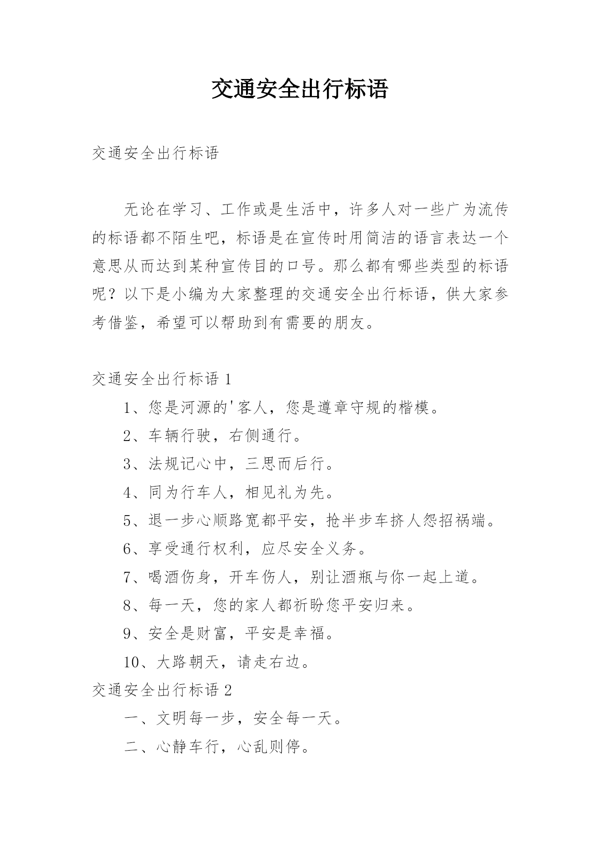 交通安全出行标语交通安全出行标语无论在学习、工作或是生活中,许多人对一些广为流传的标语都不陌生吧,标语是在宣传时用简洁的语言表达一个意思从而达到某种宣传目的口号。那么都有哪些类型的标语呢?以下是小编为大家整理的交通安全出行标语,供大家参考借鉴,希望可以帮助到有需要的朋友。交通安全出行标语11、您是河源的'客人,您是遵章守规的楷模。2、车辆行驶,右侧通行。3、法规记心中,三思而后行。4、同为行车人,相见礼为先。5、退一步心顺路宽都平安,抢半步车挤人怨招祸端。6、享受通行权利,应尽安全义务。7、喝酒伤身,开车