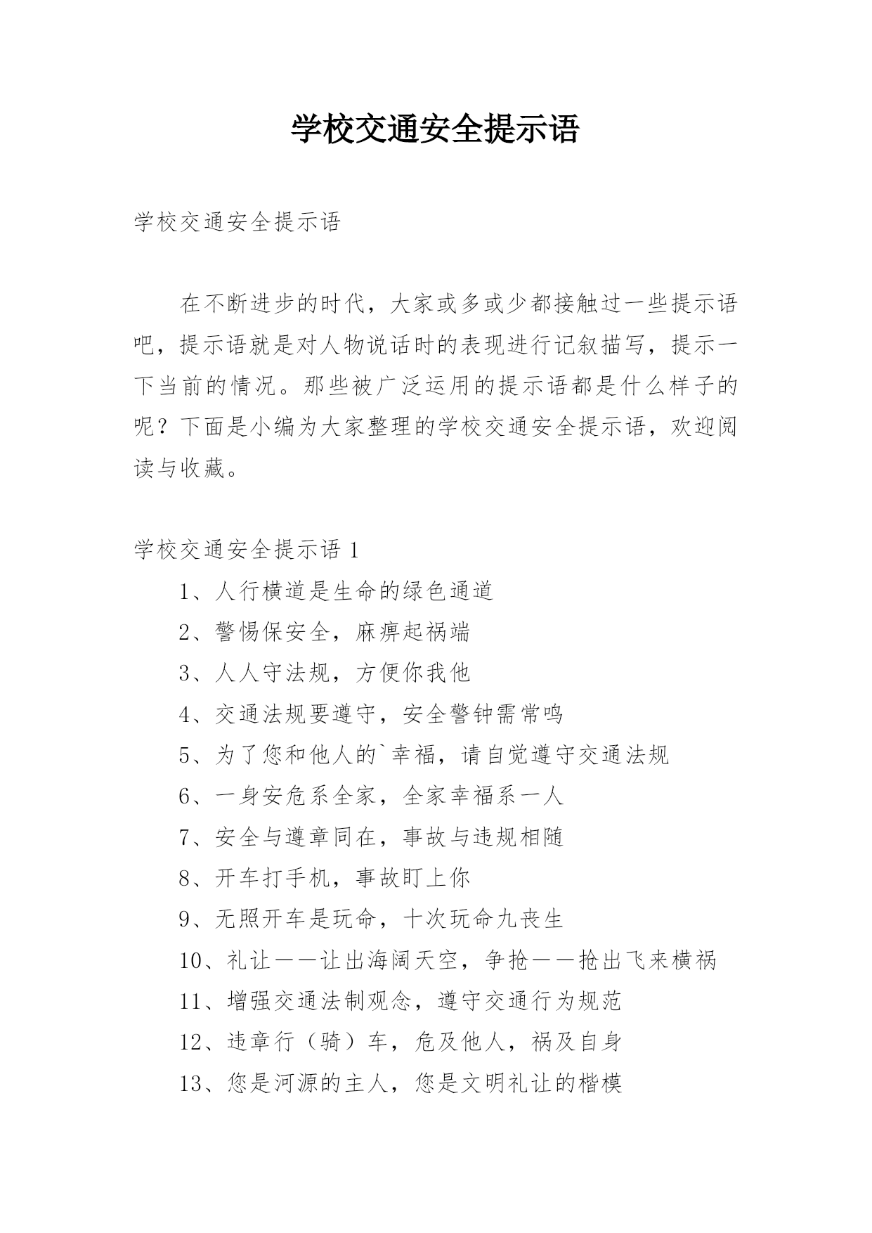 学校交通安全提示语学校交通安全提示语在不断进步的时代,大家或多或少都接触过一些提示语吧,提示语就是对人物说话时的表现进行记叙描写,提示一下当前的情况。那些被广泛运用的提示语都是什么样子的呢?下面是小编为大家整理的学校交通安全提示语,欢迎阅读与收藏。学校交通安全提示语11、人行横道是生命的绿色通道2、警惕保安全,麻痹起祸端3、人人守法规,方便你我他4、交通法规要遵守,安全警钟需常鸣5、为了您和他人的`幸福,请自觉遵守交通法规6、一身安危系全家,全家幸福系一人7、安全与遵章同在,事故与违规相随8、开车打手机,