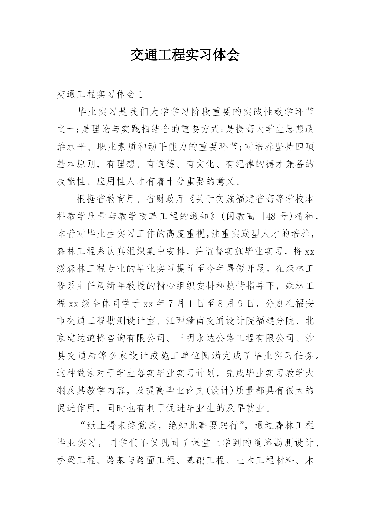 交通工程实习体会交通工程实习体会1毕业实习是我们大学学习阶段重要的实践性教学环节之一;是理论与实践相结合的重要方式;是提高大学生思想政治水平、职业素质和动手能力的重要环节;对培养坚持四项基本原则,有理想、有道德、有文化、有纪律的德才兼备的技能性、应用性人才有着十分重要的意义。根据省教育厅、省财政厅《关于实施福建省高等学校本科教学质量与教学改革工程的通知》(闽教高[]48号)精神,本着对毕业生实习工作的高度重视,注重实践型人才的培养,森林工程系认真组织集中安排,并监督实施毕业实习,将xx级森林工程专业的毕业