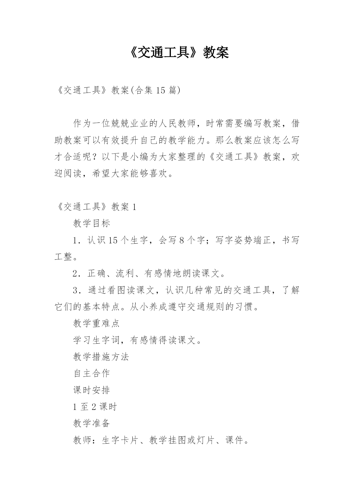 《交通工具》教案《交通工具》教案(合集15篇)作为一位兢兢业业的人民教师,时常需要编写教案,借助教案可以有效提升自己的教学能力。那么教案应该怎么写才合适呢?以下是小编为大家整理的《交通工具》教案,欢迎阅读,希望大家能够喜欢。《交通工具》教案1教学目标1.认识15个生字,会写8个字;写字姿势端正,书写工整。2.正确、流利、有感情地朗读课文。3.通过看图读课文,认识几种常见的交通工具,了解它们的基本特点。从小养成遵守交通规则的习惯。教学重难点学习生字词,有感情得读课文。教学措施方法自主合作课时安排1至2课时教