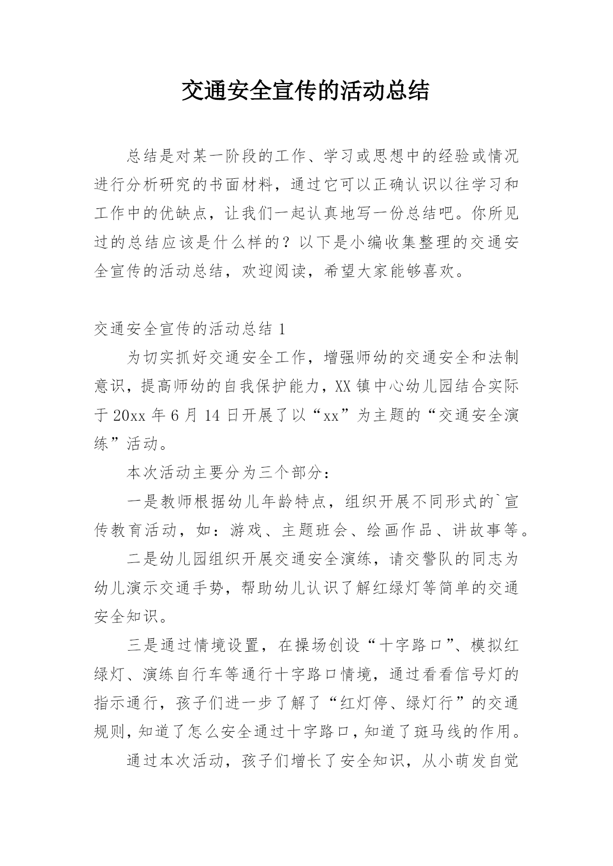 交通安全宣传的活动总结总结是对某一阶段的工作、学习或思想中的经验或情况进行分析研究的书面材料,通过它可以正确认识以往学习和工作中的优缺点,让我们一起认真地写一份总结吧。你所见过的总结应该是什么样的?以下是小编收集整理的交通安全宣传的活动总结,欢迎阅读,希望大家能够喜欢。交通安全宣传的活动总结1为切实抓好交通安全工作,增强师幼的交通安全和法制意识,提高师幼的自我保护能力,XX镇中心幼儿园结合实际于20xx年6月14日开展了以“xx”为主题的“交通安全演练”活动。本次活动主要分为三个部分:一是教师根据幼儿年龄