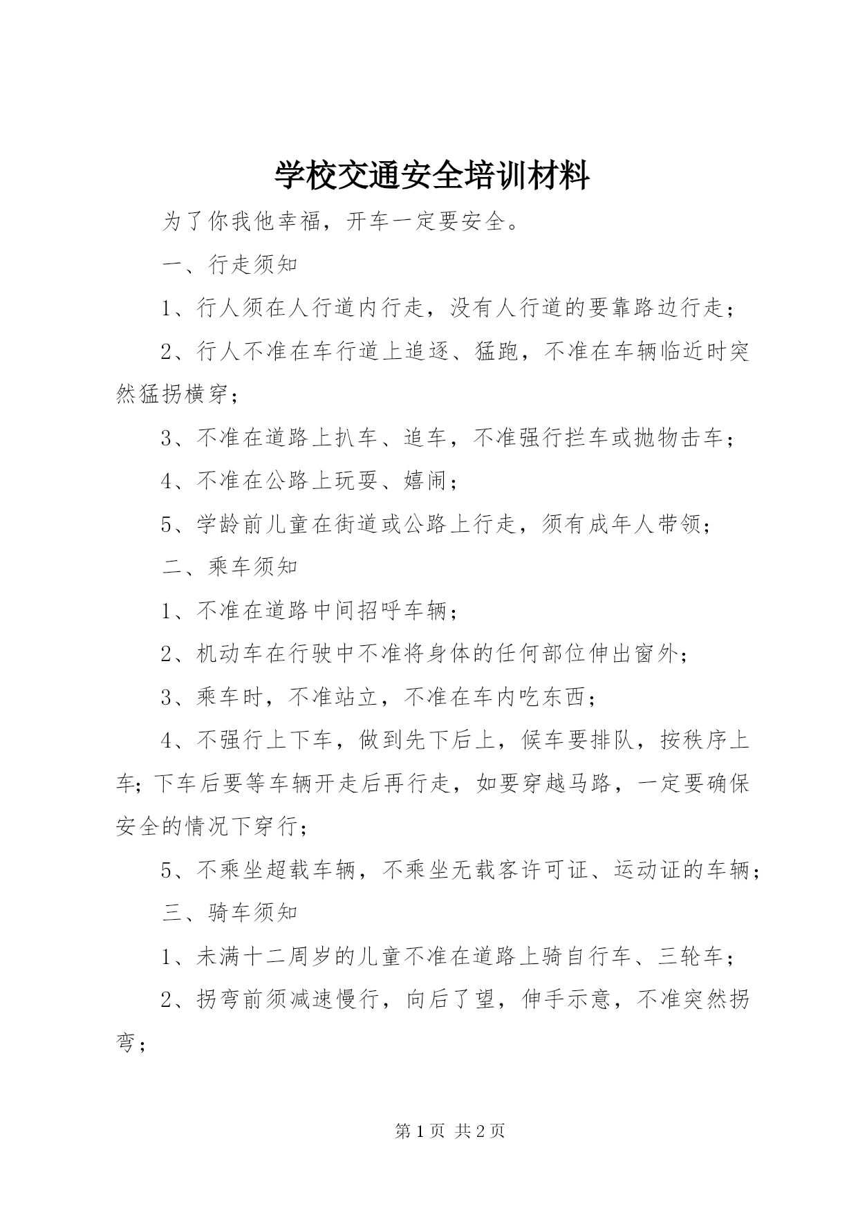 第PAGE\*Arabic\*MERGEFORMAT2页共NUMPAGES\*MERGEFORMAT2页学校交通安全培训材料为了你我他幸福,开车一定要安全。一、行走须知1、行人须在人行道内行走,没有人行道的要靠路边行走;2、行人不准在车行道上追逐、猛跑,不准在车辆临近时突然猛拐横穿;3、不准在道路上扒车、追车,不准强行拦车或抛物击车;4、不准在公路上玩耍、嬉闹;5、学龄前儿童在街道或公路上行走,须有成年人带领;二、乘车须知1、不准在道路中间招呼车辆;2、机动车在行驶中不准将身体的任何部位伸出窗