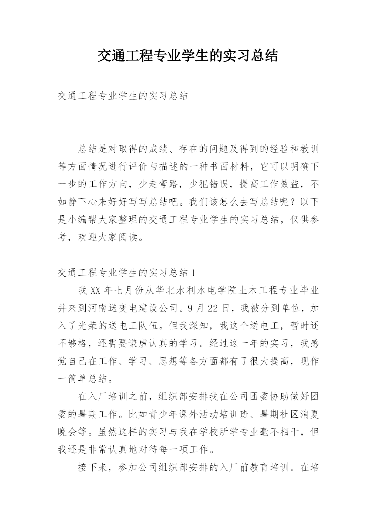 交通工程专业学生的实习总结交通工程专业学生的实习总结总结是对取得的成绩、存在的问题及得到的经验和教训等方面情况进行评价与描述的一种书面材料,它可以明确下一步的工作方向,少走弯路,少犯错误,提高工作效益,不如静下心来好好写写总结吧。我们该怎么去写总结呢?以下是小编帮大家整理的交通工程专业学生的实习总结,仅供参考,欢迎大家阅读。交通工程专业学生的实习总结1我XX年七月份从华北水利水电学院土木工程专业毕业并来到河南送变电建设公司。9月22日,我被分到单位,加入了光荣的送电工队伍。但我深知,我这个送电工,暂时还不