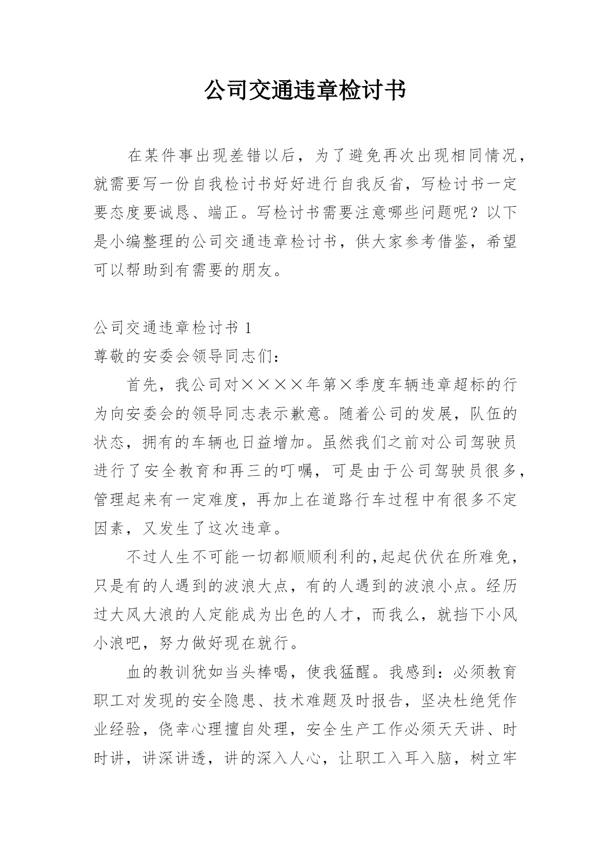 公司交通违章检讨书在某件事出现差错以后,为了避免再次出现相同情况,就需要写一份自我检讨书好好进行自我反省,写检讨书一定要态度要诚恳、端正。写检讨书需要注意哪些问题呢?以下是小编整理的公司交通违章检讨书,供大家参考借鉴,希望可以帮助到有需要的朋友。公司交通违章检讨书1尊敬的安委会领导同志们:首先,我公司对××××年第×季度车辆违章超标的行为向安委会的领导同志表示歉意。随着公司的发展,队伍的状态,拥有的车辆也日益增加。虽然我们之前对公司驾驶员进行了安全教育和再三的叮嘱,可是由于公司驾驶员很多,管理起来有一定难
