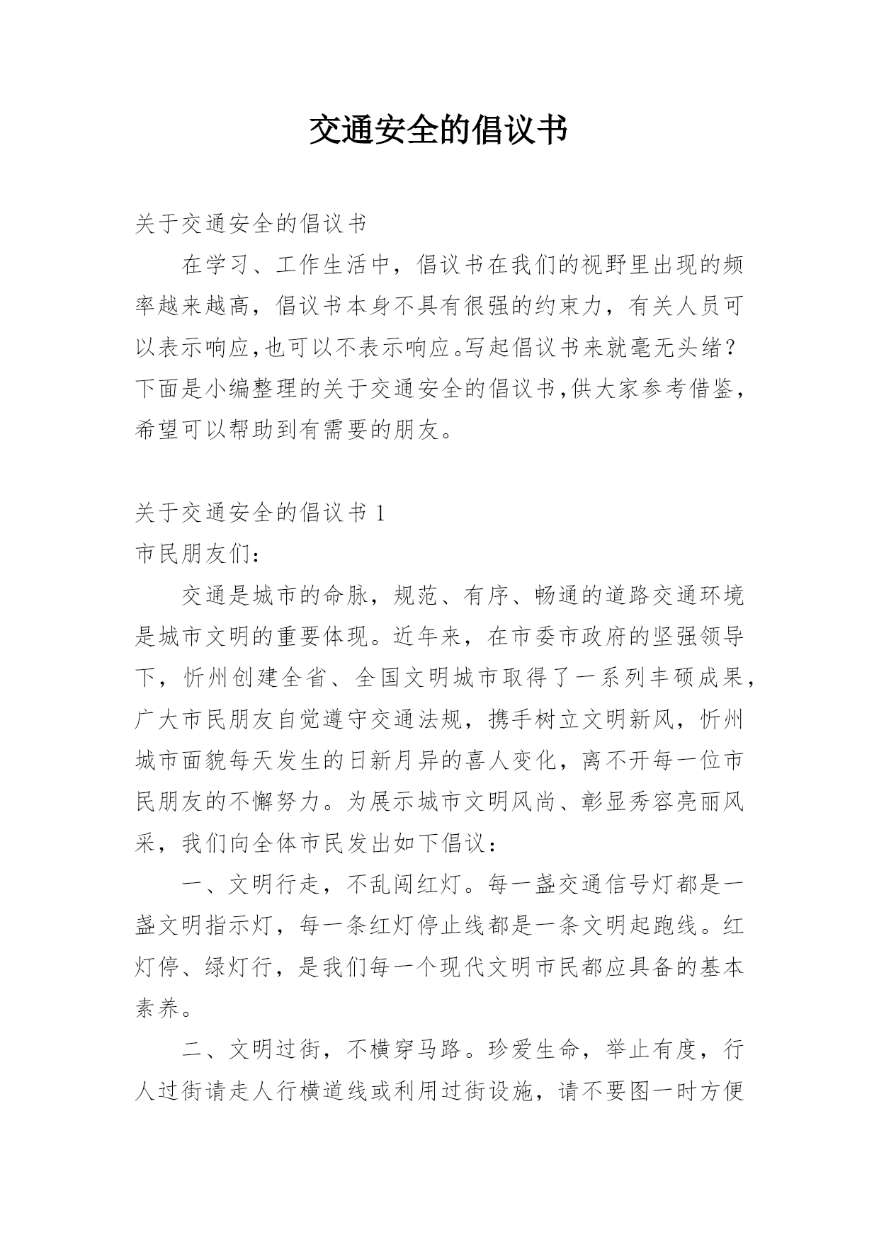交通安全的倡议书关于交通安全的倡议书在学习、工作生活中,倡议书在我们的视野里出现的频率越来越高,倡议书本身不具有很强的约束力,有关人员可以表示响应,也可以不表示响应。写起倡议书来就毫无头绪?下面是小编整理的关于交通安全的倡议书,供大家参考借鉴,希望可以帮助到有需要的朋友。关于交通安全的倡议书1市民朋友们:交通是城市的命脉,规范、有序、畅通的道路交通环境是城市文明的重要体现。近年来,在市委市政府的坚强领导下,忻州创建全省、全国文明城市取得了一系列丰硕成果,广大市民朋友自觉遵守交通法规,携手树立文明新风,忻州
