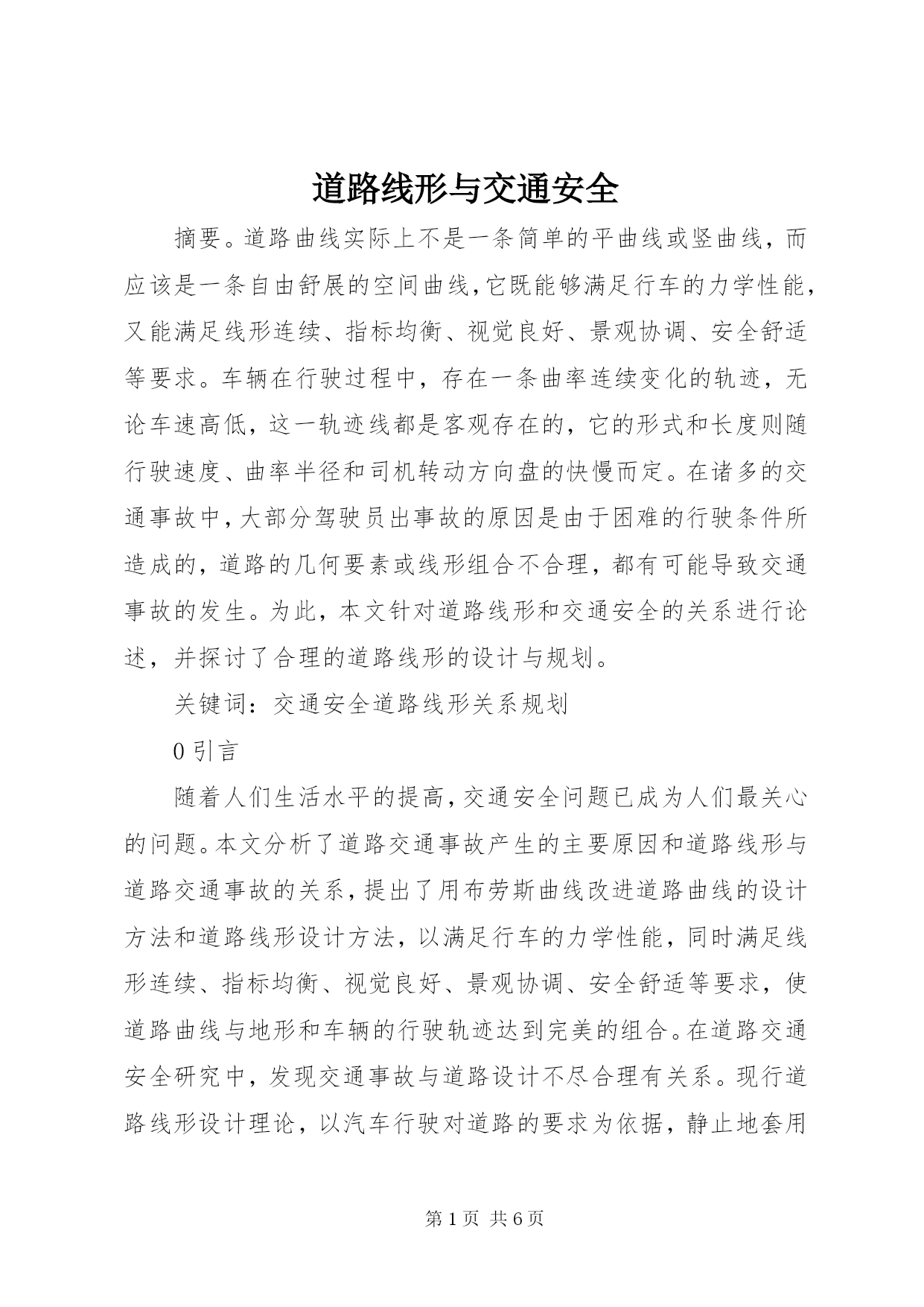 第PAGE\*Arabic\*MERGEFORMAT6页共NUMPAGES\*MERGEFORMAT6页道路线形与交通安全摘要。道路曲线实际上不是一条简单的平曲线或竖曲线,而应该是一条自由舒展的空间曲线,它既能够满足行车的力学性能,又能满足线形连续、指标均衡、视觉良好、景观协调、安全舒适等要求。车辆在行驶过程中,存在一条曲率连续变化的轨迹,无论车速高低,这一轨迹线都是客观存在的,它的形式和长度则随行驶速度、曲率半径和司机转动方向盘的快慢而定。在诸多的交通事故中,大部分驾驶员出事故的原因是由于困