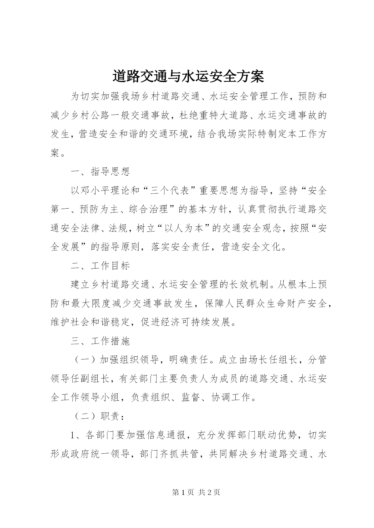 第PAGE\*Arabic\*MERGEFORMAT2页共NUMPAGES\*MERGEFORMAT2页道路交通与水运安全方案为切实加强我场乡村道路交通、水运安全管理工作,预防和减少乡村公路一般交通事故,杜绝重特大道路、水运交通事故的发生,营造安全和谐的交通环境,结合我场实际特制定本工作方案。一、指导思想以邓小平理论和“三个代表”重要思想为指导,坚持“安全第一、预防为主、综合治理”的基本方针,认真贯彻执行道路交通安全法律、法规,树立“以人为本”的交通安全观念,按照“安全发展”的指导原则,落实安