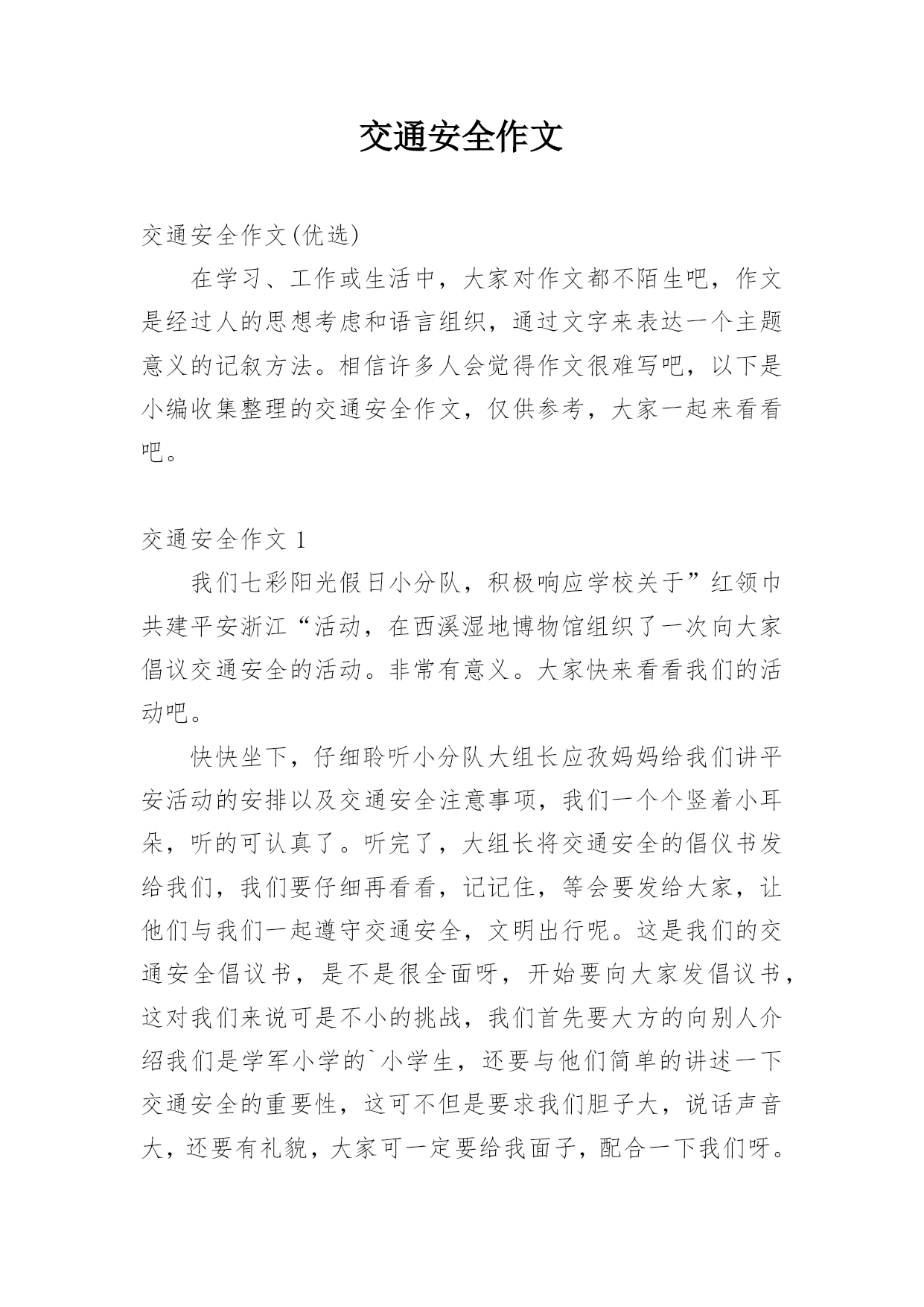 交通安全作文交通安全作文(优选)在学习、工作或生活中,大家对作文都不陌生吧,作文是经过人的思想考虑和语言组织,通过文字来表达一个主题意义的记叙方法。相信许多人会觉得作文很难写吧,以下是小编收集整理的交通安全作文,仅供参考,大家一起来看看吧。交通安全作文1我们七彩阳光假日小分队,积极响应学校关于”红领巾共建平安浙江“活动,在西溪湿地博物馆组织了一次向大家倡议交通安全的活动。非常有意义。大家快来看看我们的活动吧。快快坐下,仔细聆听小分队大组长应孜妈妈给我们讲平安活动的安排以及交通安全注意事项,我们一个个竖着小