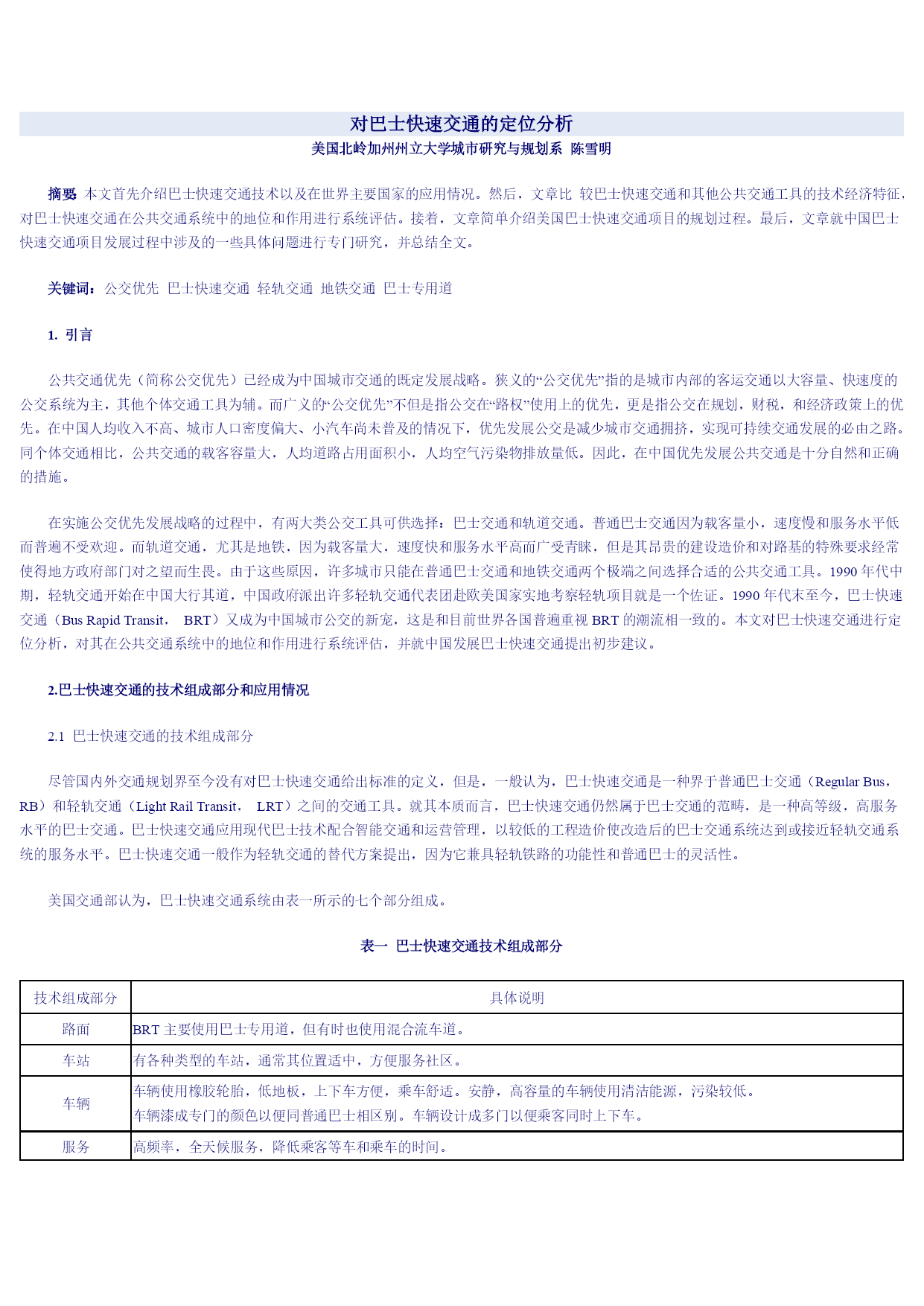 对巴士快速交通的定位分析美国北岭加州州立大学城市研究与规划系陈雪明摘要:本文首先介绍巴士快速交通技术以及在世界主要国家的应用情况。然后,文章比较巴士快速交通和其他公共交通工具的技术经济特征,对巴士快速交通在公共交通系统中的地位和作用进行系统评估。接着,文章简单介绍美国巴士快速交通项目的规划过程。最后,文章就中国巴士快速交通项目发展过程中涉及的一些具体问题进行专门研究,并总结全文。关键词:公交优先巴士快速交通轻轨交通地铁交通巴士专用道1.引言公共交通优先(简称公交优先)已经成为中国城市交通的既定发展战略。狭