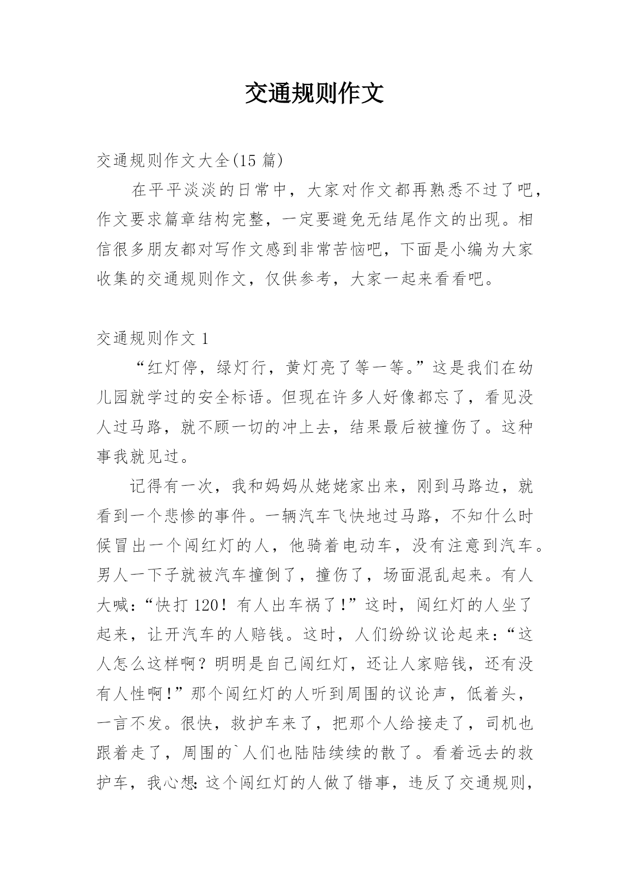 交通规则作文交通规则作文大全(15篇)在平平淡淡的日常中,大家对作文都再熟悉不过了吧,作文要求篇章结构完整,一定要避免无结尾作文的出现。相信很多朋友都对写作文感到非常苦恼吧,下面是小编为大家收集的交通规则作文,仅供参考,大家一起来看看吧。交通规则作文1“红灯停,绿灯行,黄灯亮了等一等。”这是我们在幼儿园就学过的安全标语。但现在许多人好像都忘了,看见没人过马路,就不顾一切的冲上去,结果最后被撞伤了。这种事我就见过。记得有一次,我和妈妈从姥姥家出来,刚到马路边,就看到一个悲惨的事件。一辆汽车飞快地过马路,不知