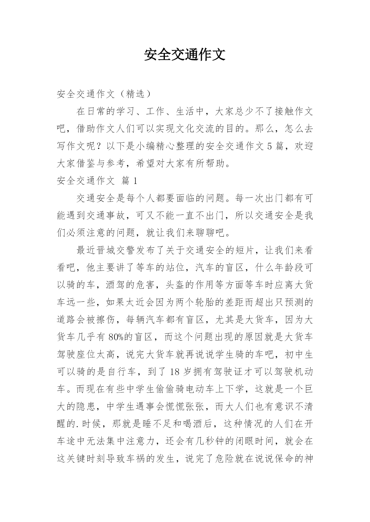 安全交通作文安全交通作文(精选)在日常的学习、工作、生活中,大家总少不了接触作文吧,借助作文人们可以实现文化交流的目的。那么,怎么去写作文呢?以下是小编精心整理的安全交通作文5篇,欢迎大家借鉴与参考,希望对大家有所帮助。安全交通作文篇1交通安全是每个人都要面临的问题。每一次出门都有可能遇到交通事故,可又不能一直不出门,所以交通安全是我们必须注意的问题,就让我们来聊聊吧。最近晋城交警发布了关于交通安全的短片,让我们来看看吧,他主要讲了等车的站位,汽车的盲区,什么年龄段可以骑的车,酒驾的危害,头盔的作用等方面