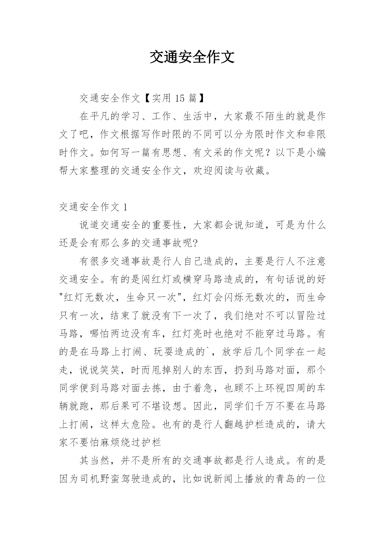 交通安全作文交通安全作文【实用15篇】在平凡的学习、工作、生活中,大家最不陌生的就是作文了吧,作文根据写作时限的不同可以分为限时作文和非限时作文。如何写一篇有思想、有文采的作文呢?以下是小编帮大家整理的交通安全作文,欢迎阅读与收藏。交通安全作文1说道交通安全的重要性,大家都会说知道,可是为什么还是会有那么多的交通事故呢?有很多交通事故是行人自己造成的,主要是行人不注意交通安全。有的是闯红灯或横穿马路造成的,有句话说的好"红灯无数次,生命只一次",红灯会闪烁无数次的,而生命只有一次,结束了就没有下一次了,我