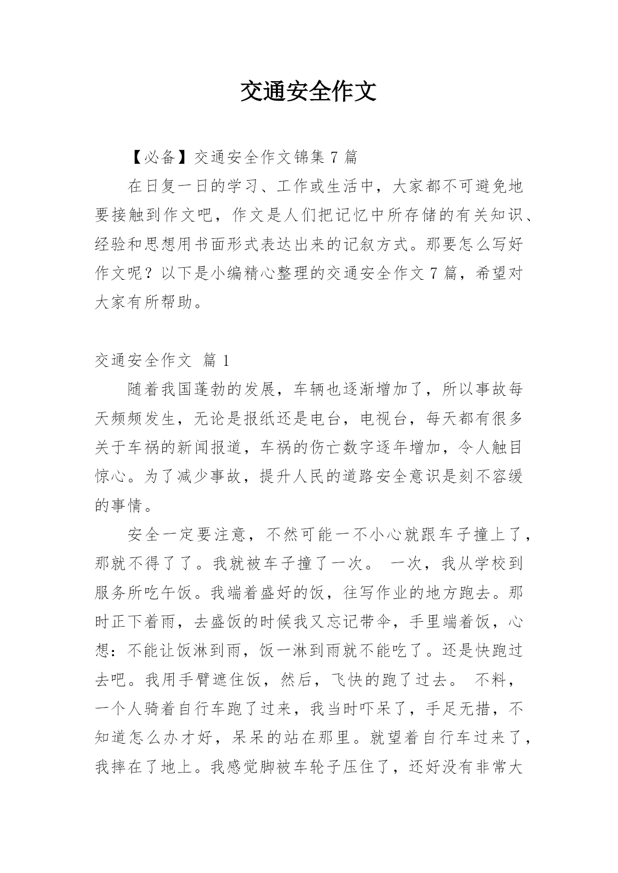 交通安全作文【必备】交通安全作文锦集7篇在日复一日的学习、工作或生活中,大家都不可避免地要接触到作文吧,作文是人们把记忆中所存储的有关知识、经验和思想用书面形式表达出来的记叙方式。那要怎么写好作文呢?以下是小编精心整理的交通安全作文7篇,希望对大家有所帮助。交通安全作文篇1随着我国蓬勃的发展,车辆也逐渐增加了,所以事故每天频频发生,无论是报纸还是电台,电视台,每天都有很多关于车祸的新闻报道,车祸的伤亡数字逐年增加,令人触目惊心。为了减少事故,提升人民的道路安全意识是刻不容缓的事情。安全一定要注意,不然可能