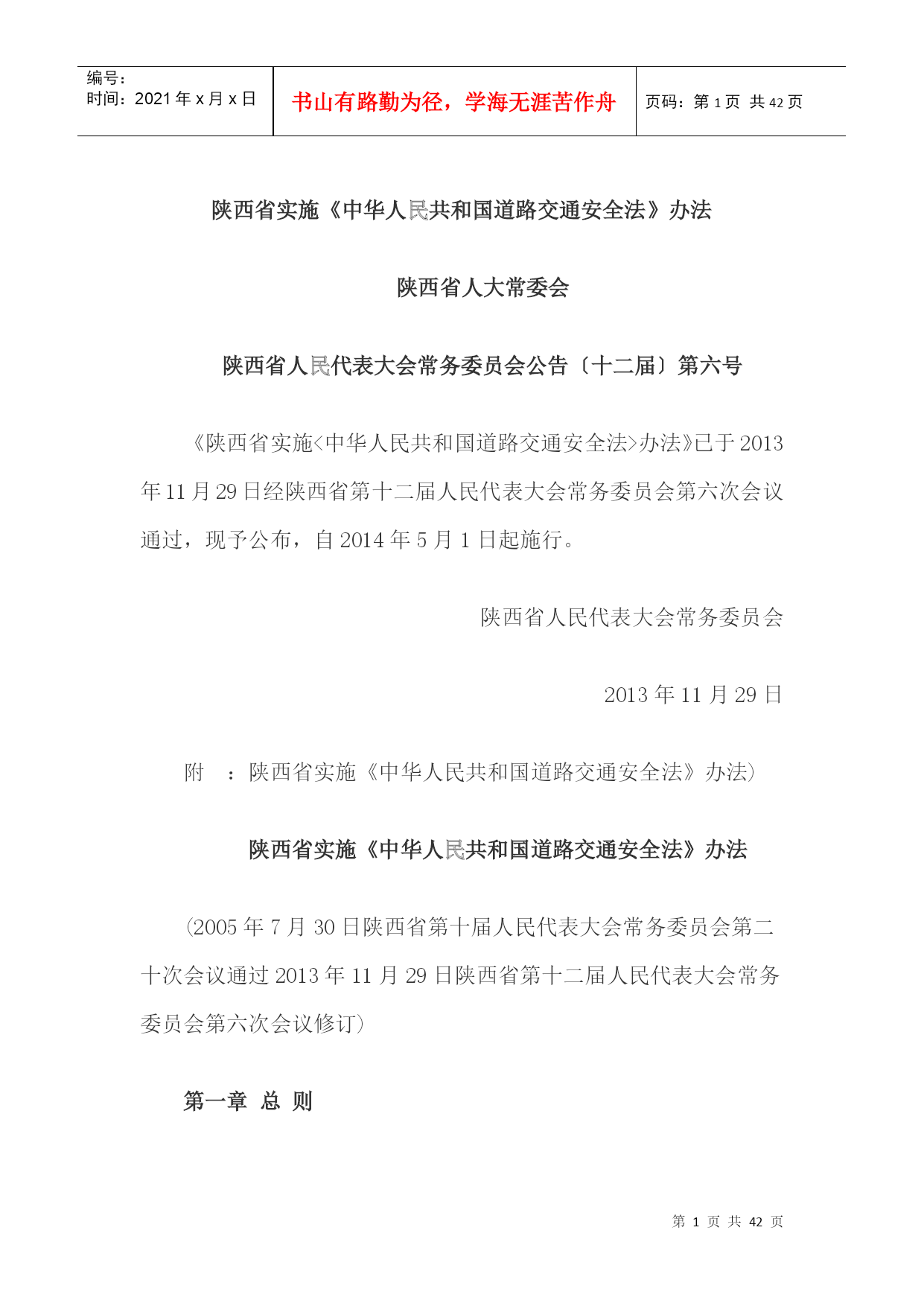 编号:时间:2021年x月x日书山有路勤为径,学海无涯苦作舟页码:第PAGE42页共NUMPAGES42页第PAGE\*MERGEFORMAT42页共NUMPAGES\*MERGEFORMAT42页陕西省实施《HYPERLINK"http://www.lawtime.cn/info/jiaotong/jtlawdljtaqf/2009071534309.html"\t"_blank"中华人民共和国道路交通安全法》办法陕西省人大常委会陕西省人民代表大会常务委员会公告〔十二届〕第