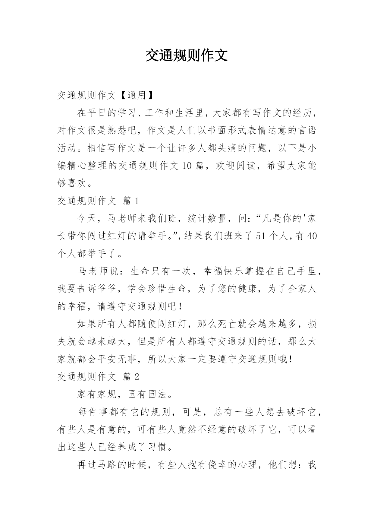 交通规则作文交通规则作文【通用】在平日的学习、工作和生活里,大家都有写作文的经历,对作文很是熟悉吧,作文是人们以书面形式表情达意的言语活动。相信写作文是一个让许多人都头痛的问题,以下是小编精心整理的交通规则作文10篇,欢迎阅读,希望大家能够喜欢。交通规则作文篇1今天,马老师来我们班,统计数量,问:“凡是你的'家长带你闯过红灯的请举手。”,结果我们班来了51个人,有40个人都举手了。马老师说:生命只有一次,幸福快乐掌握在自己手里,我要告诉爷爷,学会珍惜生命,为了您的健康,为了全家人的幸福,请遵守交通规则吧!