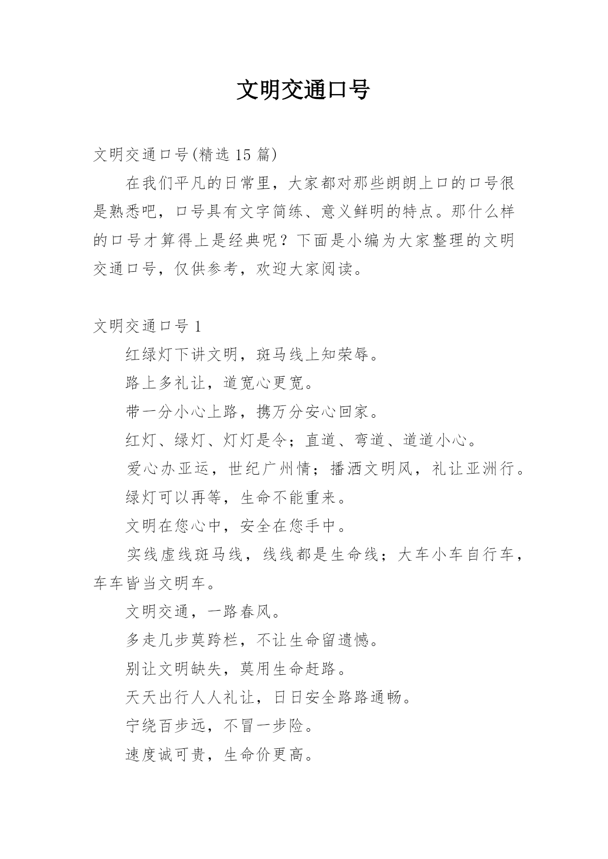文明交通口号文明交通口号(精选15篇)在我们平凡的日常里,大家都对那些朗朗上口的口号很是熟悉吧,口号具有文字简练、意义鲜明的特点。那什么样的口号才算得上是经典呢?下面是小编为大家整理的文明交通口号,仅供参考,欢迎大家阅读。文明交通口号1红绿灯下讲文明,斑马线上知荣辱。路上多礼让,道宽心更宽。带一分小心上路,携万分安心回家。红灯、绿灯、灯灯是令;直道、弯道、道道小心。爱心办亚运,世纪广州情;播洒文明风,礼让亚洲行。绿灯可以再等,生命不能重来。文明在您心中,安全在您手中。实线虚线斑马线,线线都是生命线;大车小