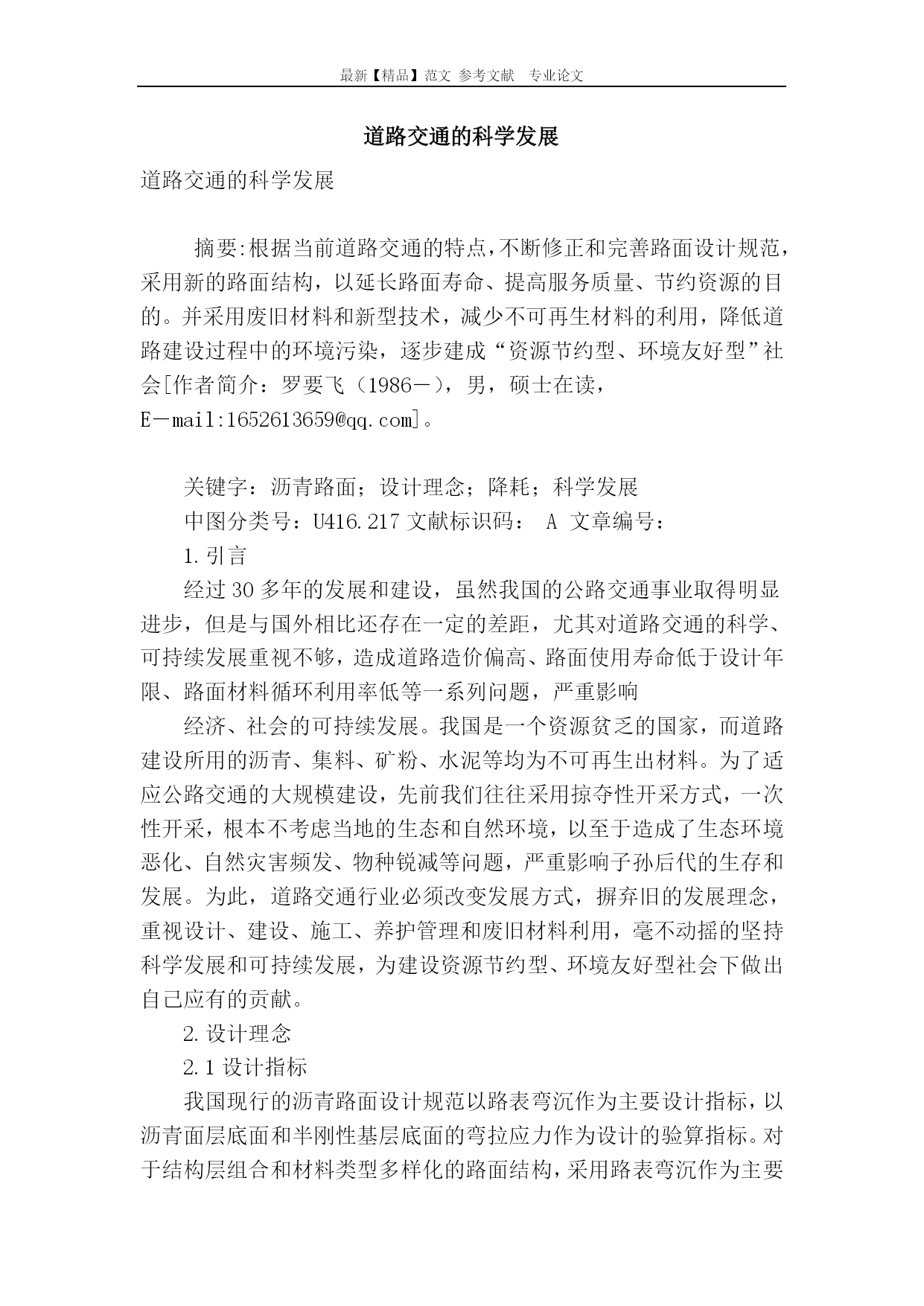最新【精品】范文参考文献专业论文道路交通的科学发展道路交通的科学发展摘要:根据当前道路交通的特点,不断修正和完善路面设计规范,采用新的路面结构,以延长路面寿命、提高服务质量、节约资源的目的。并采用废旧材料和新型技术,减少不可再生材料的利用,降低道路建设过程中的环境污染,逐步建成“资源节约型、环境友好型”社会[作者简介:罗要飞(1986―),男,硕士在读,E―mail:1652613659@qq.com]。关键字:沥青路面;设计理念;降耗;科学发展中图分类号:U416.217文献标识码:A文章编号:1.引言
