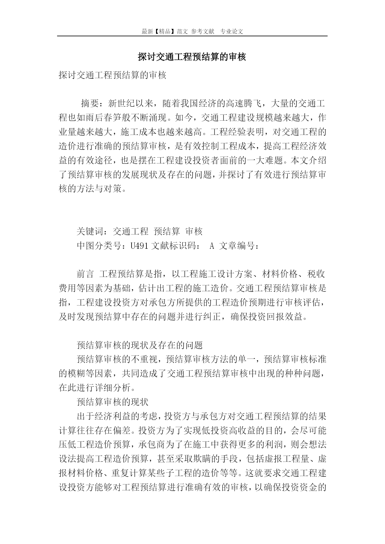 最新【精品】范文参考文献专业论文探讨交通工程预结算的审核探讨交通工程预结算的审核摘要:新世纪以来,随着我国经济的高速腾飞,大量的交通工程也如雨后春笋般不断涌现。如今,交通工程建设规模越来越大,作业量越来越大,施工成本也越来越高。工程经验表明,对交通工程的造价进行准确的预结算审核,是有效控制工程成本,提高工程经济效益的有效途径,也是摆在工程建设投资者面前的一大难题。本文介绍了预结算审核的发展现状及存在的问题,并探讨了有效进行预结算审核的方法与对策。关键词:交通工程预结算审核中图分类号:U491文献标识码:A
