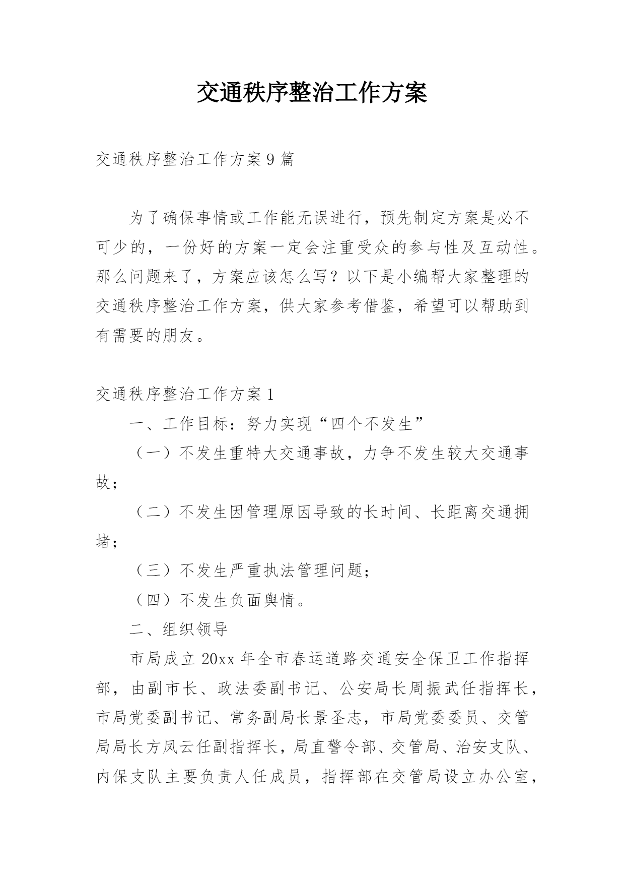 交通秩序整治工作方案交通秩序整治工作方案9篇为了确保事情或工作能无误进行,预先制定方案是必不可少的,一份好的方案一定会注重受众的参与性及互动性。那么问题来了,方案应该怎么写?以下是小编帮大家整理的交通秩序整治工作方案,供大家参考借鉴,希望可以帮助到有需要的朋友。交通秩序整治工作方案1一、工作目标:努力实现“四个不发生”(一)不发生重特大交通事故,力争不发生较大交通事故;(二)不发生因管理原因导致的长时间、长距离交通拥堵;(三)不发生严重执法管理问题;(四)不发生负面舆情。二、组织领导市局成立20xx年全市