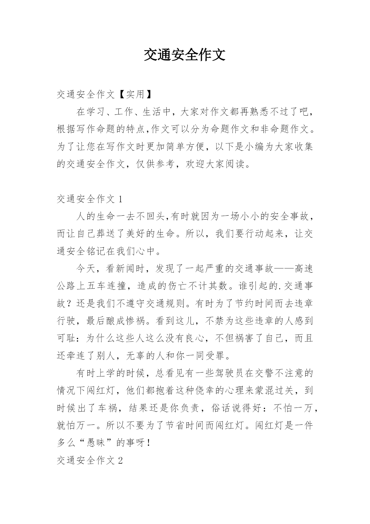 交通安全作文交通安全作文【实用】在学习、工作、生活中,大家对作文都再熟悉不过了吧,根据写作命题的特点,作文可以分为命题作文和非命题作文。为了让您在写作文时更加简单方便,以下是小编为大家收集的交通安全作文,仅供参考,欢迎大家阅读。交通安全作文1人的生命一去不回头,有时就因为一场小小的安全事故,而让自己葬送了美好的生命。所以,我们要行动起来,让交通安全铭记在我们心中。今天,看新闻时,发现了一起严重的交通事故——高速公路上五车连撞,造成的伤亡不计其数。谁引起的.交通事故?还是我们不遵守交通规则。有时为了节约时间