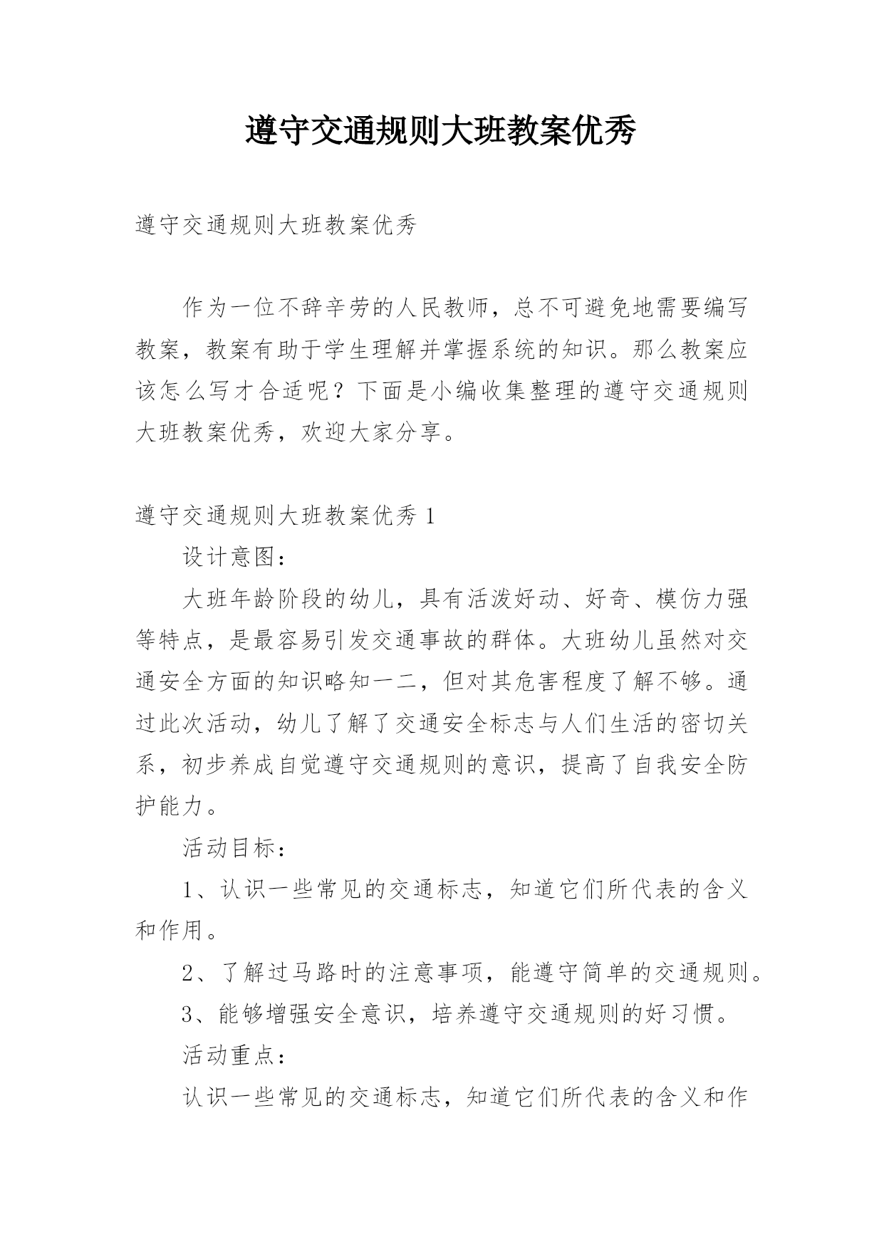 遵守交通规则大班教案优秀遵守交通规则大班教案优秀作为一位不辞辛劳的人民教师,总不可避免地需要编写教案,教案有助于学生理解并掌握系统的知识。那么教案应该怎么写才合适呢?下面是小编收集整理的遵守交通规则大班教案优秀,欢迎大家分享。遵守交通规则大班教案优秀1设计意图:大班年龄阶段的幼儿,具有活泼好动、好奇、模仿力强等特点,是最容易引发交通事故的群体。大班幼儿虽然对交通安全方面的知识略知一二,但对其危害程度了解不够。通过此次活动,幼儿了解了交通安全标志与人们生活的密切关系,初步养成自觉遵守交通规则的意识,提高了自