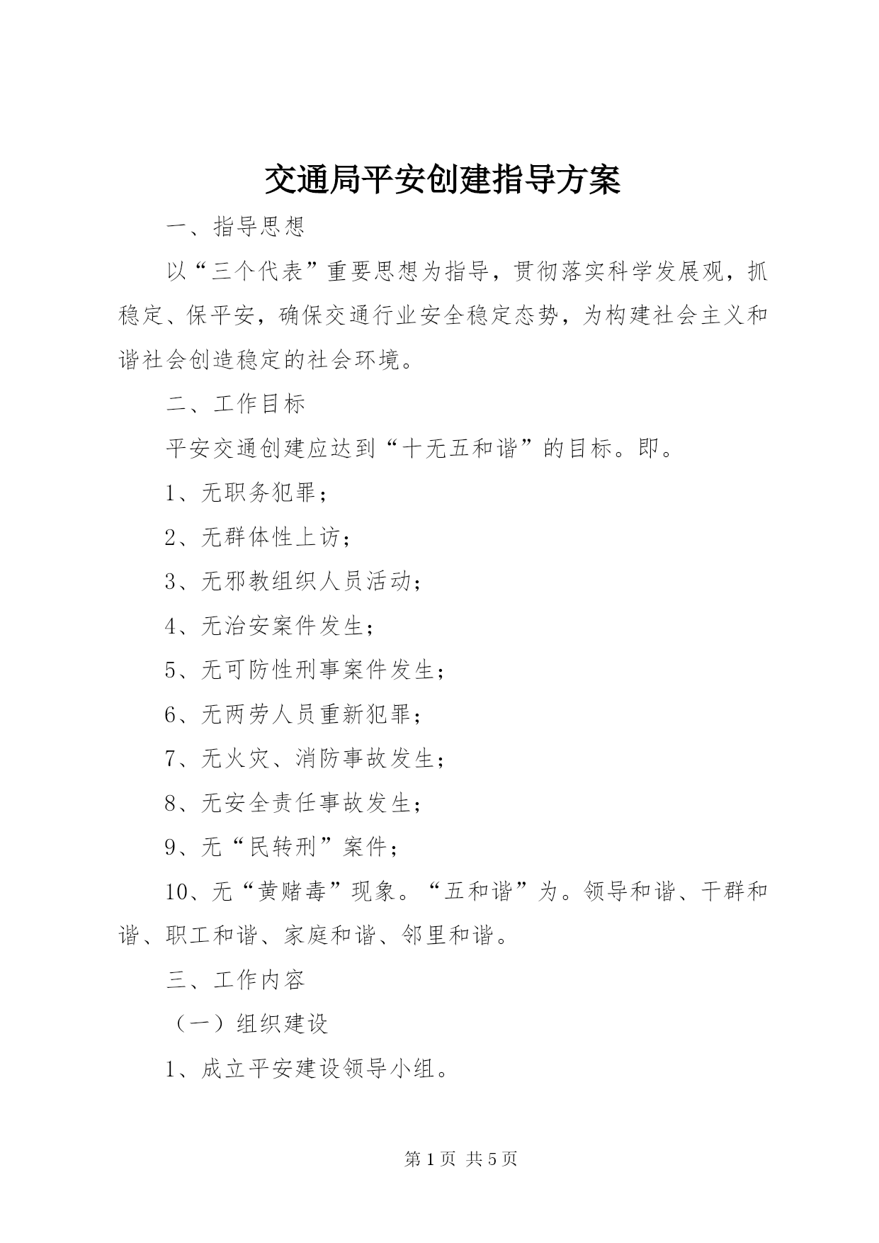 第PAGE\*Arabic\*MERGEFORMAT5页共NUMPAGES\*MERGEFORMAT5页交通局平安创建指导方案一、指导思想以“三个代表”重要思想为指导,贯彻落实科学发展观,抓稳定、保平安,确保交通行业安全稳定态势,为构建社会主义和谐社会创造稳定的社会环境。二、工作目标平安交通创建应达到“十无五和谐”的目标。即。1、无职务犯罪;2、无群体性上访;3、无邪教组织人员活动;4、无治安案件发生;5、无可防性刑事案件发生;6、无两劳人员重新犯罪;7、无火灾、消防事故发生;8、无安全责任事