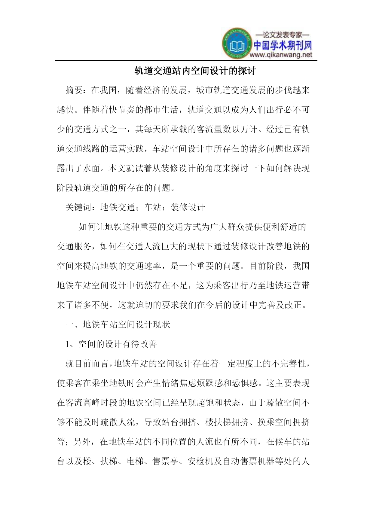 轨道交通站内空间设计的探讨摘要:在我国,随着经济的发展,城市轨道交通发展的步伐越来越快。伴随着快节奏的都市生活,轨道交通以成为人们出行必不可少的交通方式之一,其每天所承载的客流量数以万计。经过已有轨道交通线路的运营实践,车站空间设计中所存在的诸多问题也逐渐露出了水面。本文就试着从装修设计的角度来探讨一下如何解决现阶段轨道交通的所存在的问题。关键词:地铁交通;车站;装修设计如何让地铁这种重要的交通方式为广大群众提供便利舒适的交通服务,如何在交通人流巨大的现状下通过装修设计改善地铁的空间来提高地铁的交通速率,