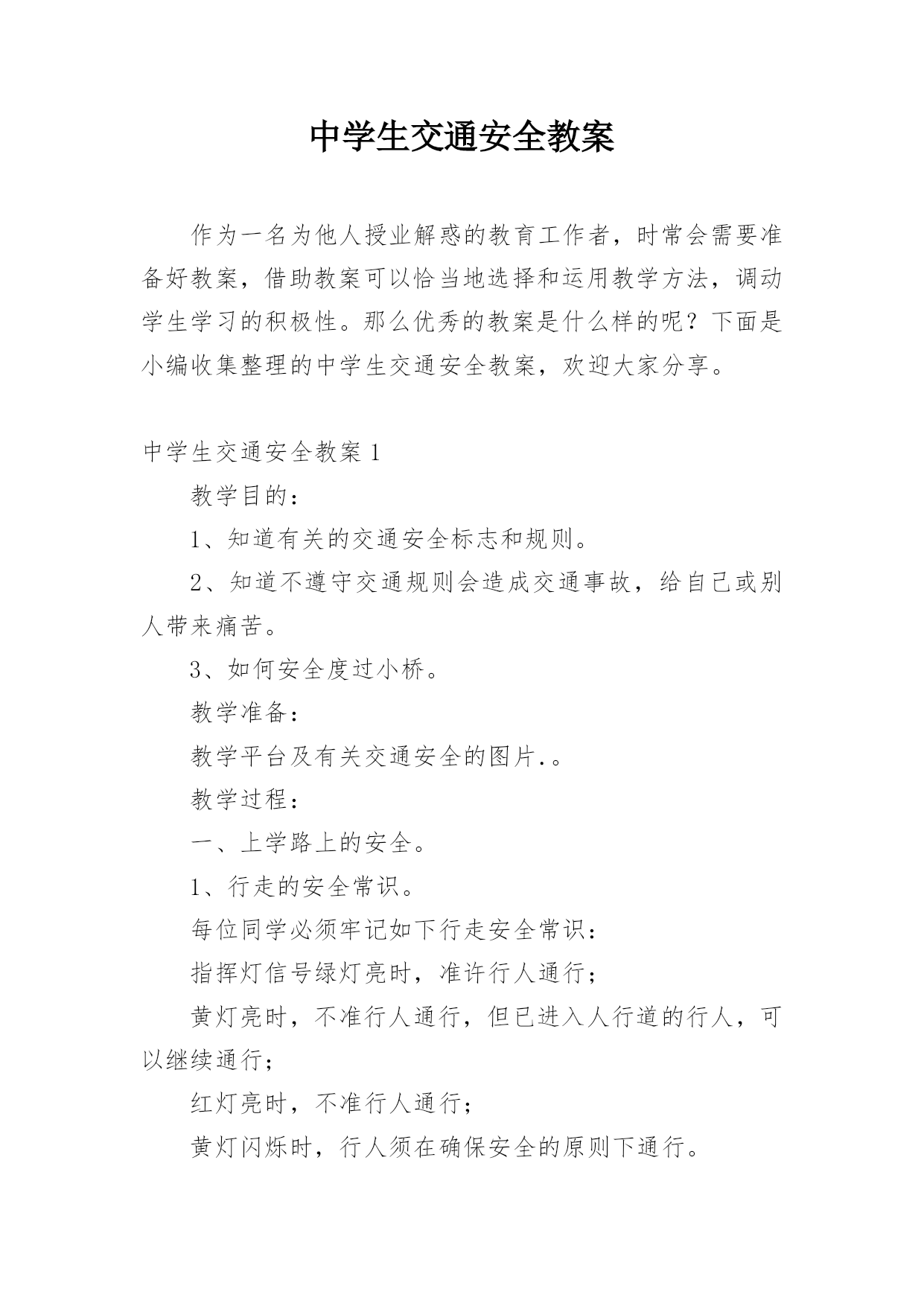 中学生交通安全教案作为一名为他人授业解惑的教育工作者,时常会需要准备好教案,借助教案可以恰当地选择和运用教学方法,调动学生学习的积极性。那么优秀的教案是什么样的呢?下面是小编收集整理的中学生交通安全教案,欢迎大家分享。中学生交通安全教案1教学目的:1、知道有关的交通安全标志和规则。2、知道不遵守交通规则会造成交通事故,给自己或别人带来痛苦。3、如何安全度过小桥。教学准备:教学平台及有关交通安全的图片.。教学过程:一、上学路上的安全。1、行走的安全常识。每位同学必须牢记如下行走安全常识:指挥灯信号绿灯亮时,
