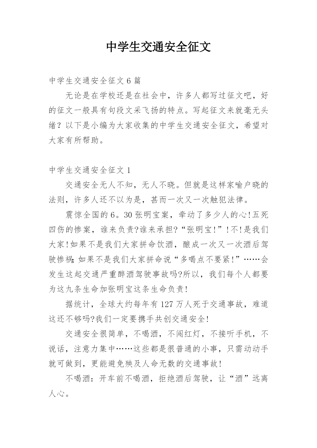 中学生交通安全征文中学生交通安全征文6篇无论是在学校还是在社会中,许多人都写过征文吧,好的征文一般具有句段文采飞扬的特点。写起征文来就毫无头绪?以下是小编为大家收集的中学生交通安全征文,希望对大家有所帮助。中学生交通安全征文1交通安全无人不知,无人不晓。但就是这样家喻户晓的法则,许多人还不以为是,甚而一次又一次触犯法律。震惊全国的6。30张明宝案,牵动了多少人的心!五死四伤的惨案,谁来负责?谁来承担?“张明宝!”!不!是我们大家!如果不是我们大家拼命饮酒,酿成一次又一次酒后驾驶惨祸;如果不是我们大家拼命说