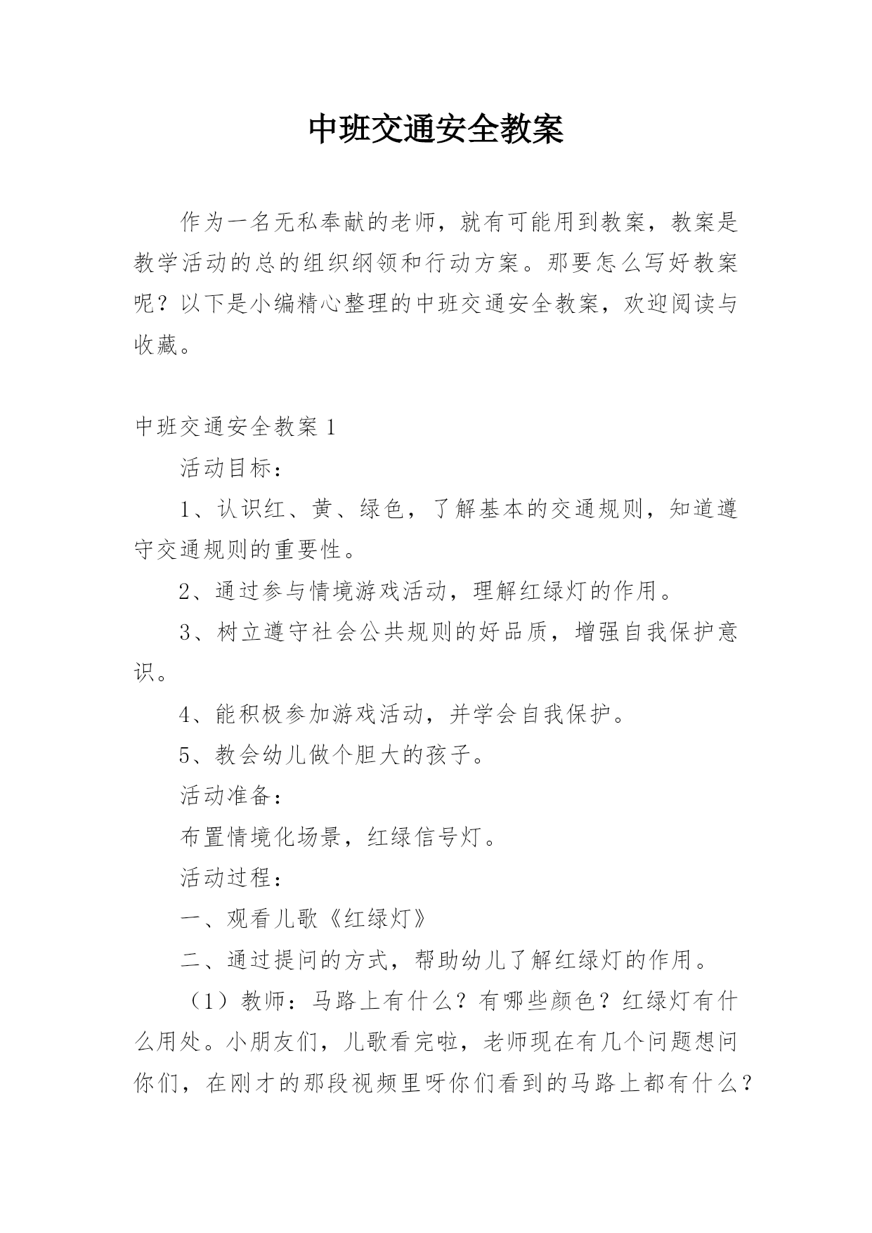 中班交通安全教案【集合】中班交通安全教案作为一名为他人授业解惑的教育工作者,就难以避免地要准备教案,借助教案可以提高教学质量,收到预期的教学效果。那么你有了解过教案吗?下面是小编为大家整理的中班交通安全教案,欢迎阅读与收藏。中班交通安全教案1活动目标:1、使幼儿知道交警叔叔工作很辛苦,很重要,教育幼儿要热爱他们。2、让幼儿初步了解红绿灯和人行横道的作用,能根据信号做动作,听从红绿灯的指挥,教育他们不要在马路上乱跑,提醒幼儿注意安全。3、培养幼儿自我保护能力。4、培养幼儿动脑思考问题、解决问题的能力。5、能