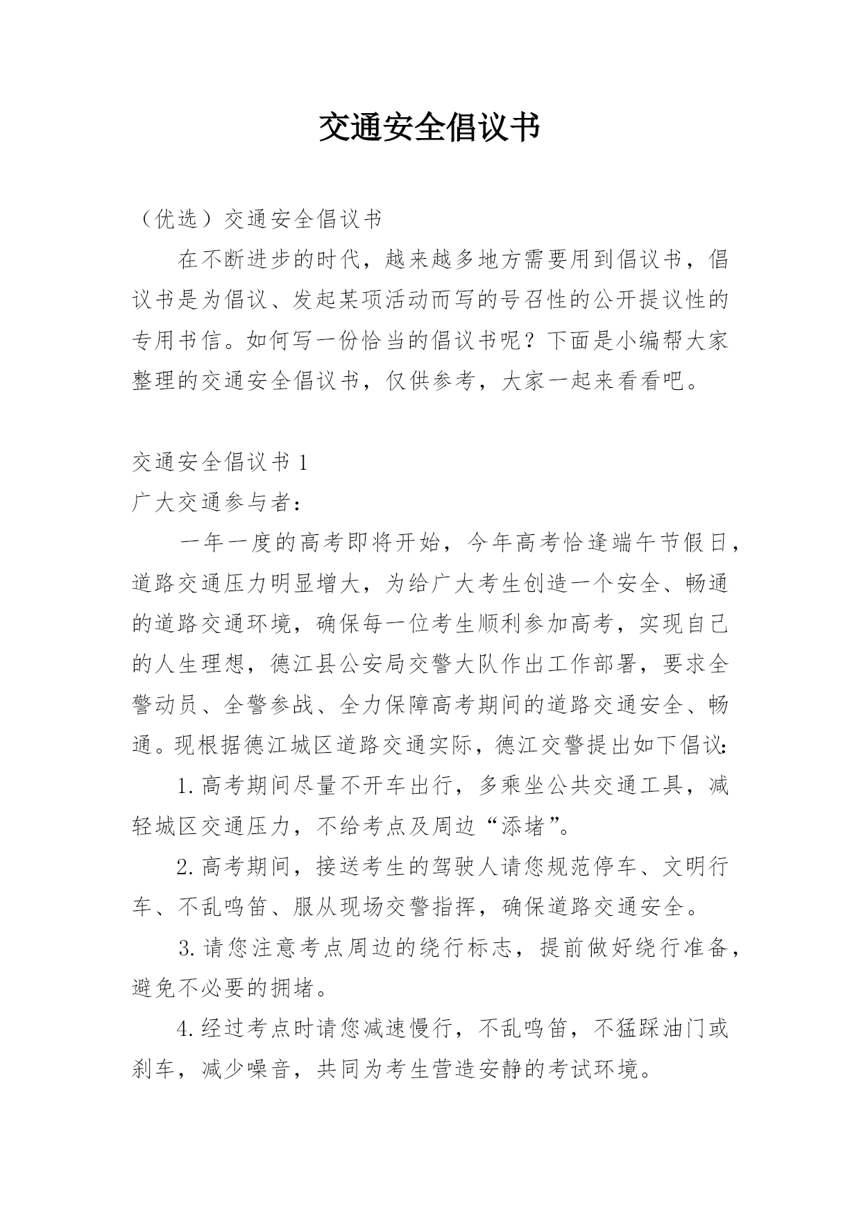 交通安全倡议书(优选)交通安全倡议书在不断进步的时代,越来越多地方需要用到倡议书,倡议书是为倡议、发起某项活动而写的号召性的公开提议性的专用书信。如何写一份恰当的倡议书呢?下面是小编帮大家整理的交通安全倡议书,仅供参考,大家一起来看看吧。交通安全倡议书1广大交通参与者:一年一度的高考即将开始,今年高考恰逢端午节假日,道路交通压力明显增大,为给广大考生创造一个安全、畅通的道路交通环境,确保每一位考生顺利参加高考,实现自己的人生理想,德江县公安局交警大队作出工作部署,要求全警动员、全警参战、全力保障高考期间的