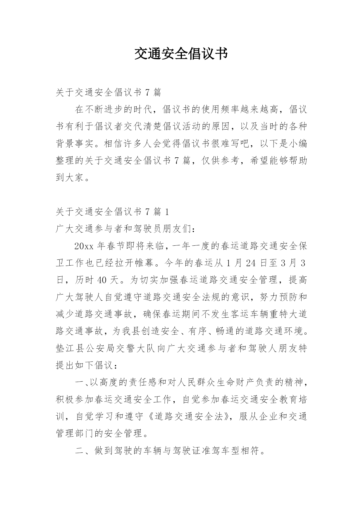 交通安全倡议书关于交通安全倡议书7篇在不断进步的时代,倡议书的使用频率越来越高,倡议书有利于倡议者交代清楚倡议活动的原因,以及当时的各种背景事实。相信许多人会觉得倡议书很难写吧,以下是小编整理的关于交通安全倡议书7篇,仅供参考,希望能够帮助到大家。关于交通安全倡议书7篇1广大交通参与者和驾驶员朋友们:20xx年春节即将来临,一年一度的春运道路交通安全保卫工作也已经拉开帷幕。今年的春运从1月24日至3月3日,历时40天。为切实加强春运道路交通安全管理,提高广大驾驶人自觉遵守道路交通安全法规的意识,努力预防和