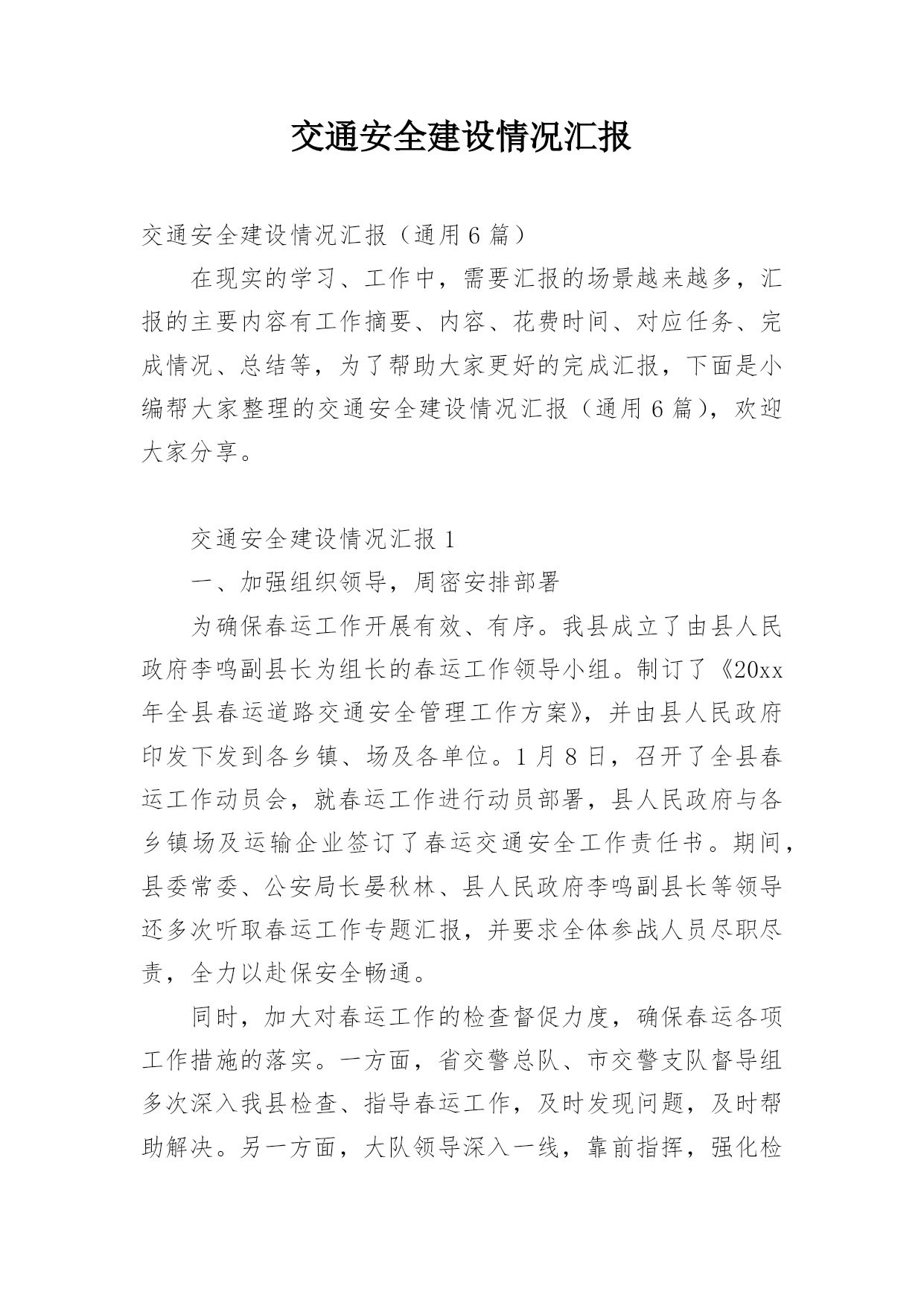 交通安全建设情况汇报交通安全建设情况汇报(通用6篇)在现实的学习、工作中,需要汇报的场景越来越多,汇报的主要内容有工作摘要、内容、花费时间、对应任务、完成情况、总结等,为了帮助大家更好的完成汇报,下面是小编帮大家整理的交通安全建设情况汇报(通用6篇),欢迎大家分享。交通安全建设情况汇报1一、加强组织领导,周密安排部署为确保春运工作开展有效、有序。我县成立了由县人民政府李鸣副县长为组长的春运工作领导小组。制订了《20xx年全县春运道路交通安全管理工作方案》,并由县人民政府印发下发到各乡镇、场及各单位。1月8