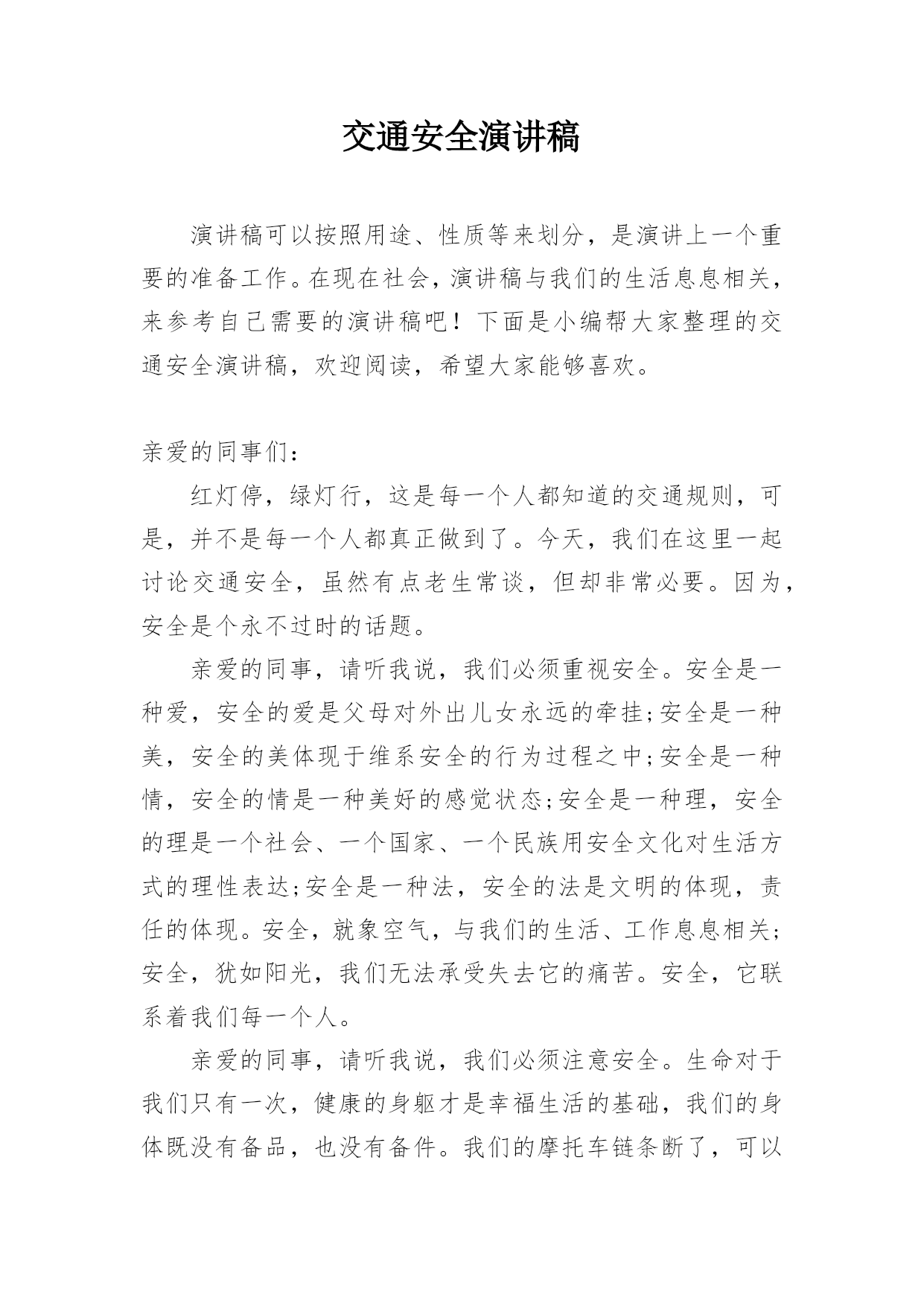 交通安全演讲稿演讲稿可以按照用途、性质等来划分,是演讲上一个重要的准备工作。在现在社会,演讲稿与我们的生活息息相关,来参考自己需要的演讲稿吧!下面是小编帮大家整理的交通安全演讲稿,欢迎阅读,希望大家能够喜欢。亲爱的同事们:红灯停,绿灯行,这是每一个人都知道的交通规则,可是,并不是每一个人都真正做到了。今天,我们在这里一起讨论交通安全,虽然有点老生常谈,但却非常必要。因为,安全是个永不过时的话题。亲爱的同事,请听我说,我们必须重视安全。安全是一种爱,安全的爱是父母对外出儿女永远的牵挂;安全是一种美,安全的美