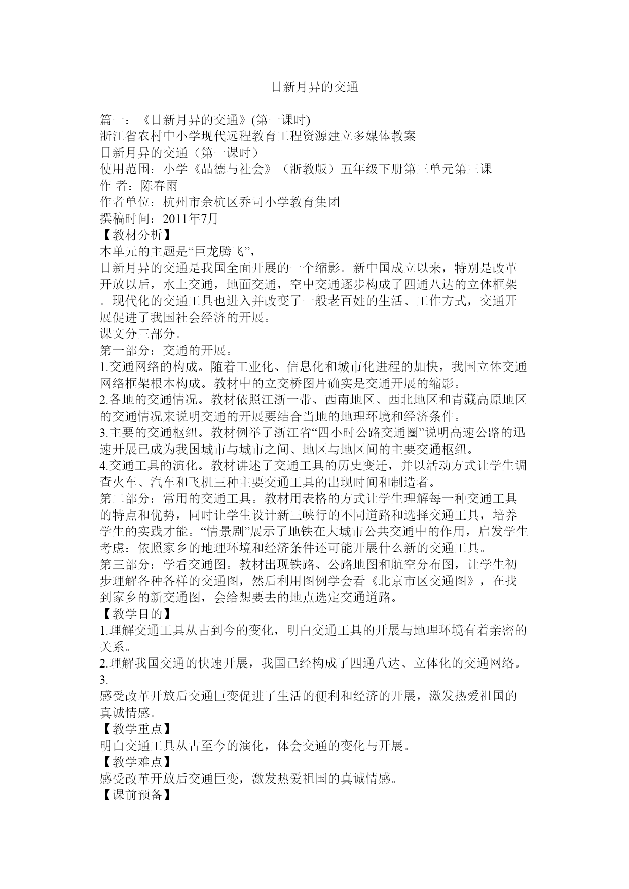 日新月异的交通篇一:《日新月异的交通》(第一课时)浙江省农村中小学现代远程教育工程资源建立多媒体教案日新月异的交通(第一课时)使用范围:小学《品德与社会》(浙教版)五年级下册第三单元第三课作者:陈春雨作者单位:杭州市余杭区乔司小学教育集团撰稿时间:2011年7月【教材分析】本单元的主题是“巨龙腾飞”,日新月异的交通是我国全面开展的一个缩影。新中国成立以来,特别是改革开放以后,水上交通,地面交通,空中交通逐步构成了四通八达的立体框架。现代化的交通工具也进入并改变了一般老百姓的生活、工作方式,交通开展促进了我