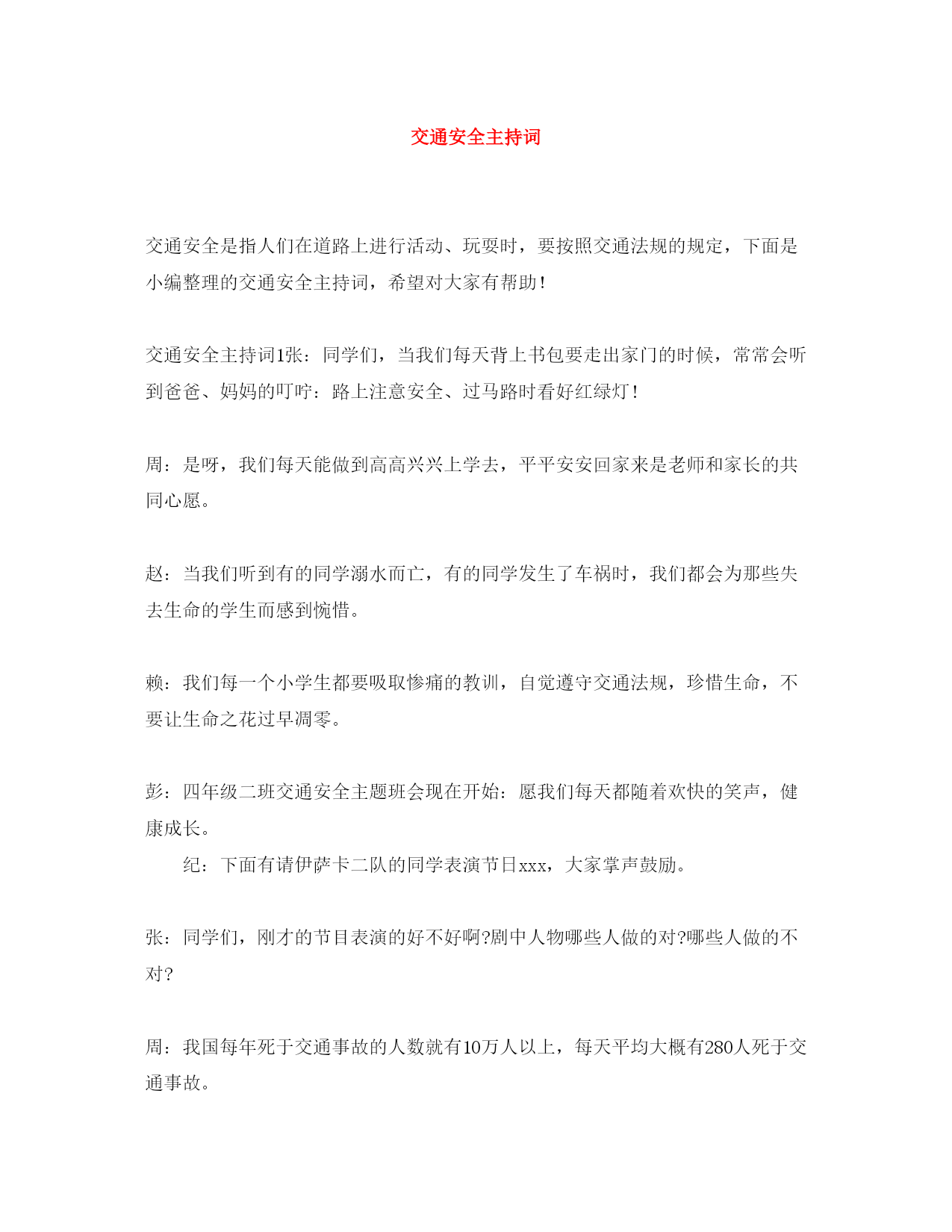 此资料由网络收集而来,如有侵权请告知上传者立即删除。资料共分享,我们负责传递知识。交通安全主持词交通安全是指人们在道路上进行活动、玩耍时,要按照交通法规的规定,下面是小编整理的交通安全主持词,希望对大家有帮助!交通安全主持词1张:同学们,当我们每天背上书包要走出家门的时候,常常会听到爸爸、妈妈的叮咛:路上注意安全、过马路时看好红绿灯!周:是呀,我们每天能做到高高兴兴上学去,平平安安回家来是老师和家长的共同心愿。赵:当我们听到有的同学溺水而亡,有的同学发生了车祸时,我们都会为那些失去生命的学生而感到惋惜。赖