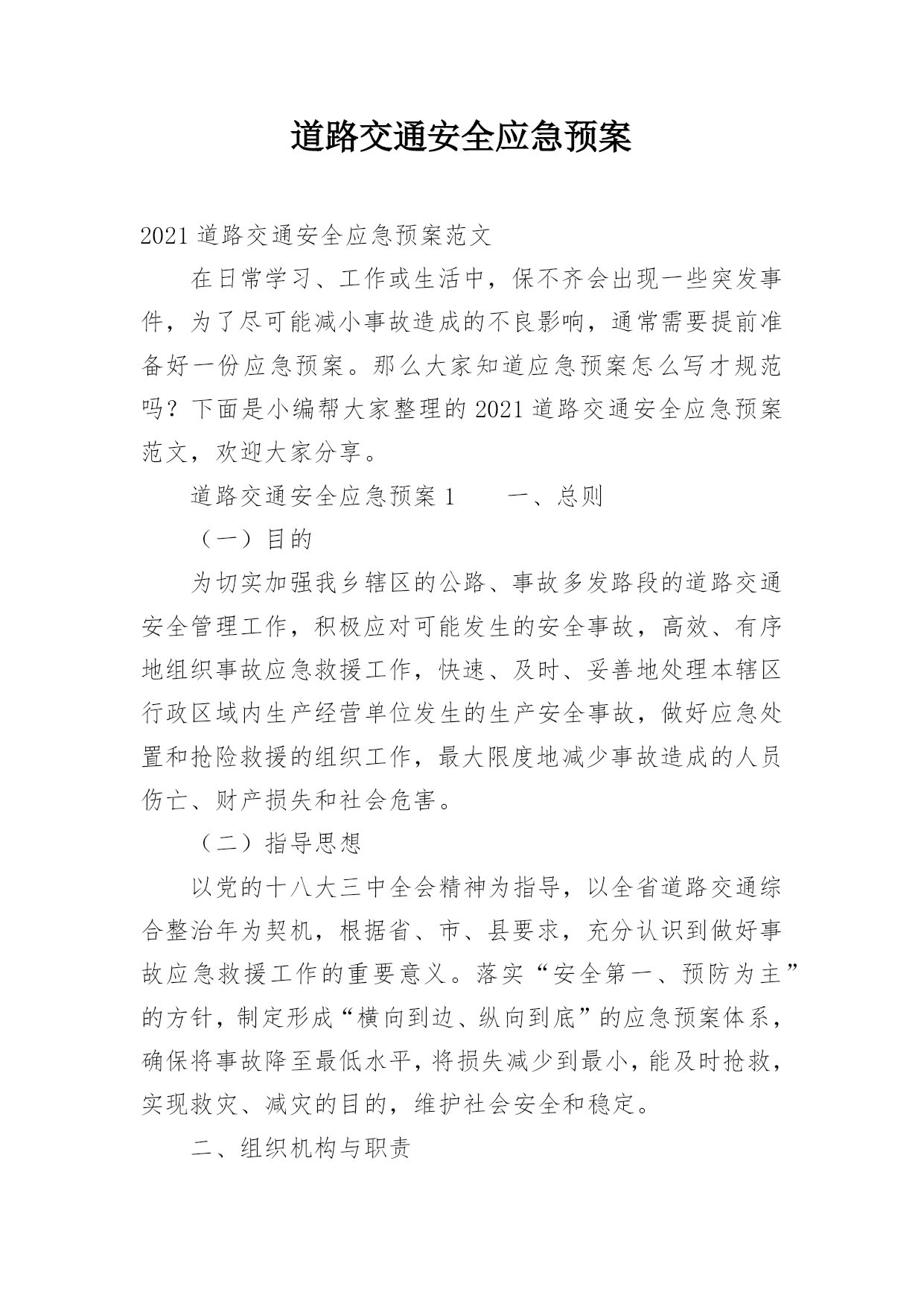 道路交通安全应急预案2021道路交通安全应急预案范文在日常学习、工作或生活中,保不齐会出现一些突发事件,为了尽可能减小事故造成的不良影响,通常需要提前准备好一份应急预案。那么大家知道应急预案怎么写才规范吗?下面是小编帮大家整理的2021道路交通安全应急预案范文,欢迎大家分享。道路交通安全应急预案1一、总则(一)目的为切实加强我乡辖区的公路、事故多发路段的道路交通安全管理工作,积极应对可能发生的安全事故,高效、有序地组织事故应急救援工作,快速、及时、妥善地处理本辖区行政区域内生产经营单位发生的生产安全事故,