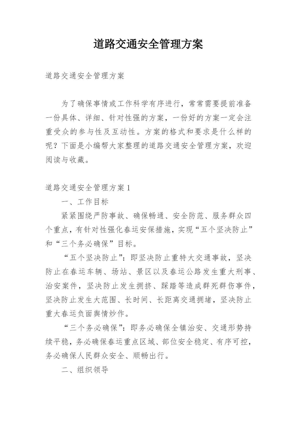道路交通安全管理方案道路交通安全管理方案为了确保事情或工作科学有序进行,常常需要提前准备一份具体、详细、针对性强的方案,一份好的方案一定会注重受众的参与性及互动性。方案的格式和要求是什么样的呢?下面是小编帮大家整理的道路交通安全管理方案,欢迎阅读与收藏。道路交通安全管理方案1一、工作目标紧紧围绕严防事故、确保畅通、安全防范、服务群众四个重点,有针对性强化春运安保措施,实现“五个坚决防止”和“三个务必确保”目标。“五个坚决防止”:即坚决防止重特大交通事故,坚决防止在春运车辆、场站、景区以及春运公路发生重大刑