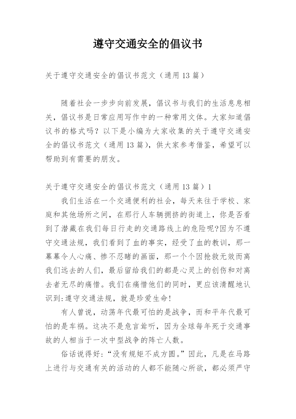 遵守交通安全的倡议书关于遵守交通安全的倡议书范文(通用13篇)随着社会一步步向前发展,倡议书与我们的生活息息相关,倡议书是日常应用写作中的一种常用文体。大家知道倡议书的格式吗?以下是小编为大家收集的关于遵守交通安全的倡议书范文(通用13篇),供大家参考借鉴,希望可以帮助到有需要的朋友。关于遵守交通安全的倡议书范文(通用13篇)1我们生活在一个交通便利的社会,每天来往于学校、家庭和其他场所之间,在那行人车辆拥挤的街道上,你是否看到了潜藏在我们每日行走的交通路线上的危险呢?因为不遵守交通法规,我们看到了血的事