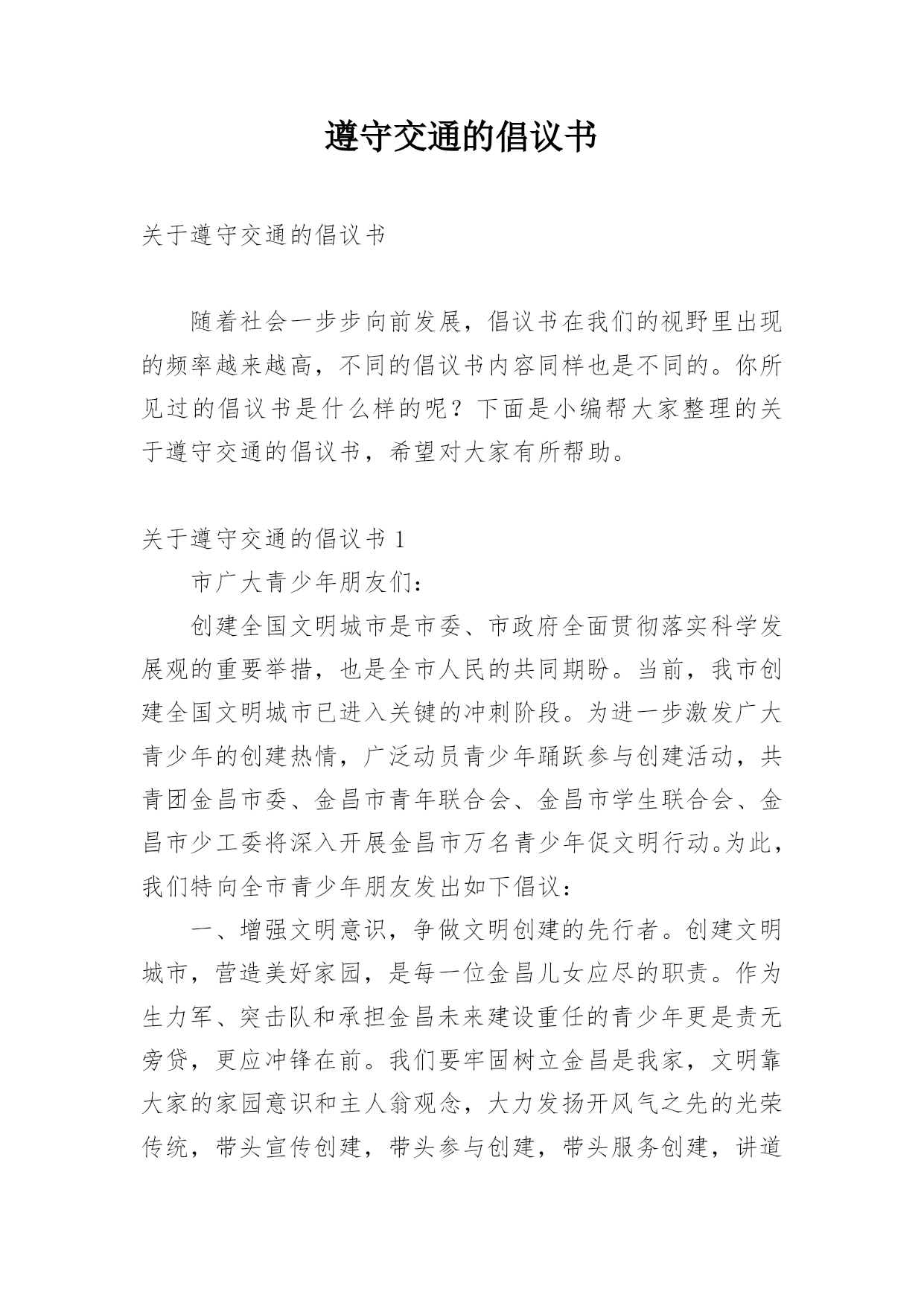 遵守交通的倡议书关于遵守交通的倡议书随着社会一步步向前发展,倡议书在我们的视野里出现的频率越来越高,不同的倡议书内容同样也是不同的。你所见过的倡议书是什么样的呢?下面是小编帮大家整理的关于遵守交通的倡议书,希望对大家有所帮助。关于遵守交通的倡议书1市广大青少年朋友们:创建全国文明城市是市委、市政府全面贯彻落实科学发展观的重要举措,也是全市人民的共同期盼。当前,我市创建全国文明城市已进入关键的冲刺阶段。为进一步激发广大青少年的创建热情,广泛动员青少年踊跃参与创建活动,共青团金昌市委、金昌市青年联合会、金昌市