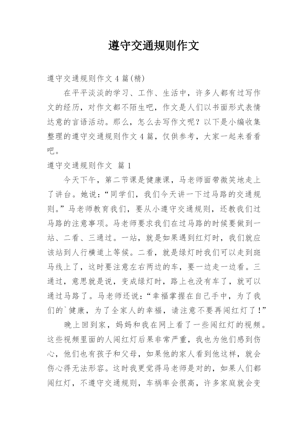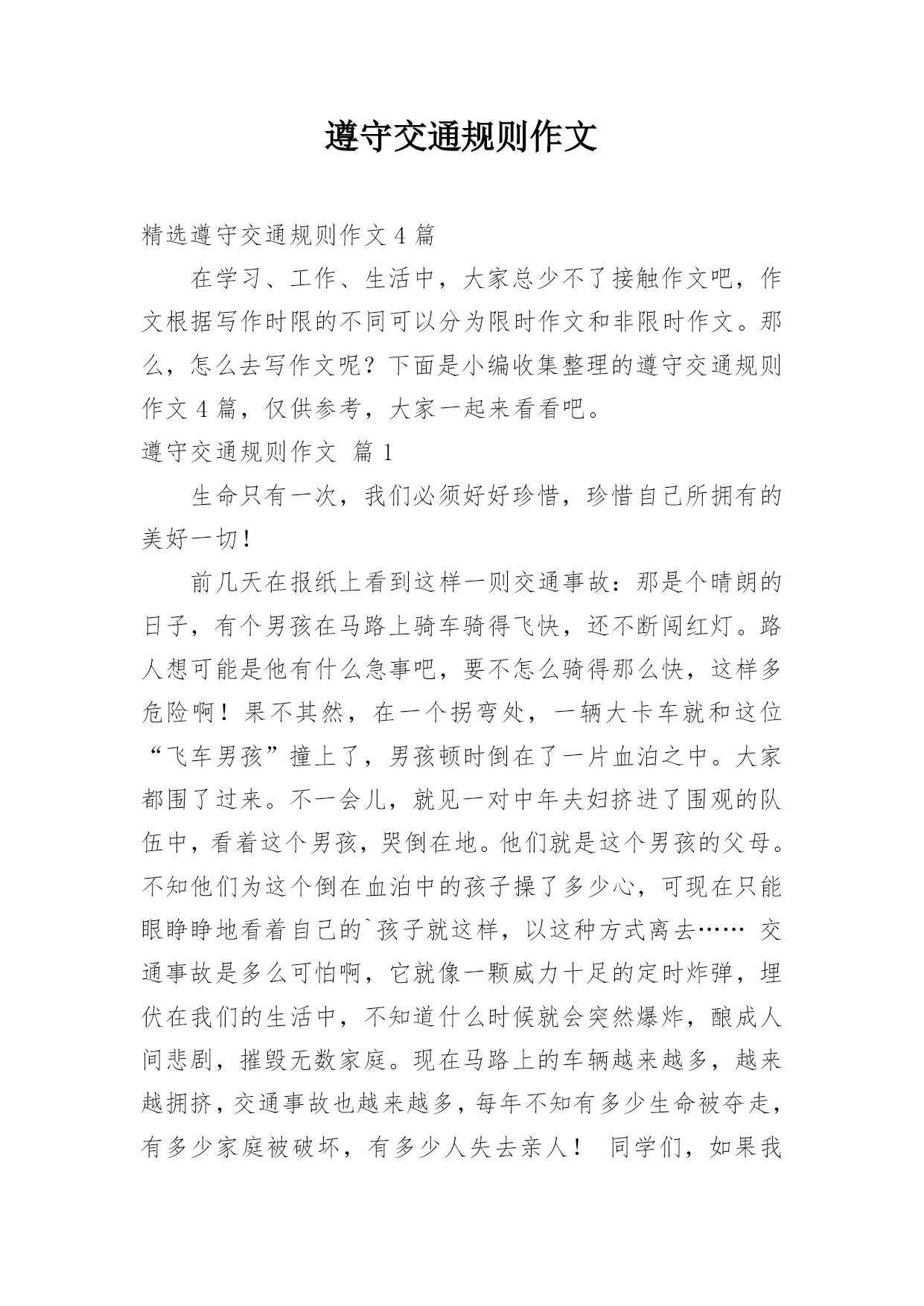 遵守交通规则作文精选遵守交通规则作文4篇在学习、工作、生活中,大家总少不了接触作文吧,作文根据写作时限的不同可以分为限时作文和非限时作文。那么,怎么去写作文呢?下面是小编收集整理的遵守交通规则作文4篇,仅供参考,大家一起来看看吧。遵守交通规则作文篇1生命只有一次,我们必须好好珍惜,珍惜自己所拥有的美好一切!前几天在报纸上看到这样一则交通事故:那是个晴朗的日子,有个男孩在马路上骑车骑得飞快,还不断闯红灯。路人想可能是他有什么急事吧,要不怎么骑得那么快,这样多危险啊!果不其然,在一个拐弯处,一辆大卡车就和这位