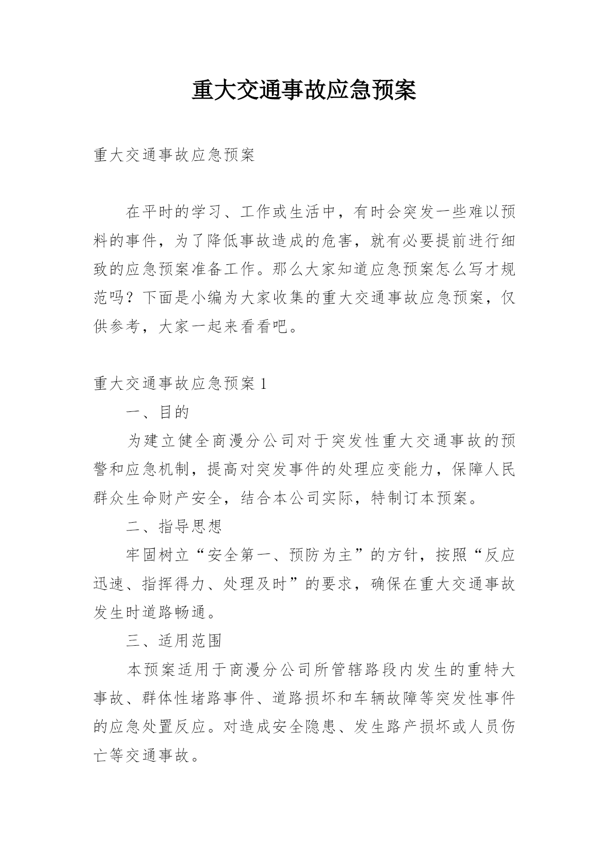 重大交通事故应急预案重大交通事故应急预案在平时的学习、工作或生活中,有时会突发一些难以预料的事件,为了降低事故造成的危害,就有必要提前进行细致的应急预案准备工作。那么大家知道应急预案怎么写才规范吗?下面是小编为大家收集的重大交通事故应急预案,仅供参考,大家一起来看看吧。重大交通事故应急预案1一、目的为建立健全商漫分公司对于突发性重大交通事故的预警和应急机制,提高对突发事件的处理应变能力,保障人民群众生命财产安全,结合本公司实际,特制订本预案。二、指导思想牢固树立“安全第一、预防为主”的方针,按照“反应迅速